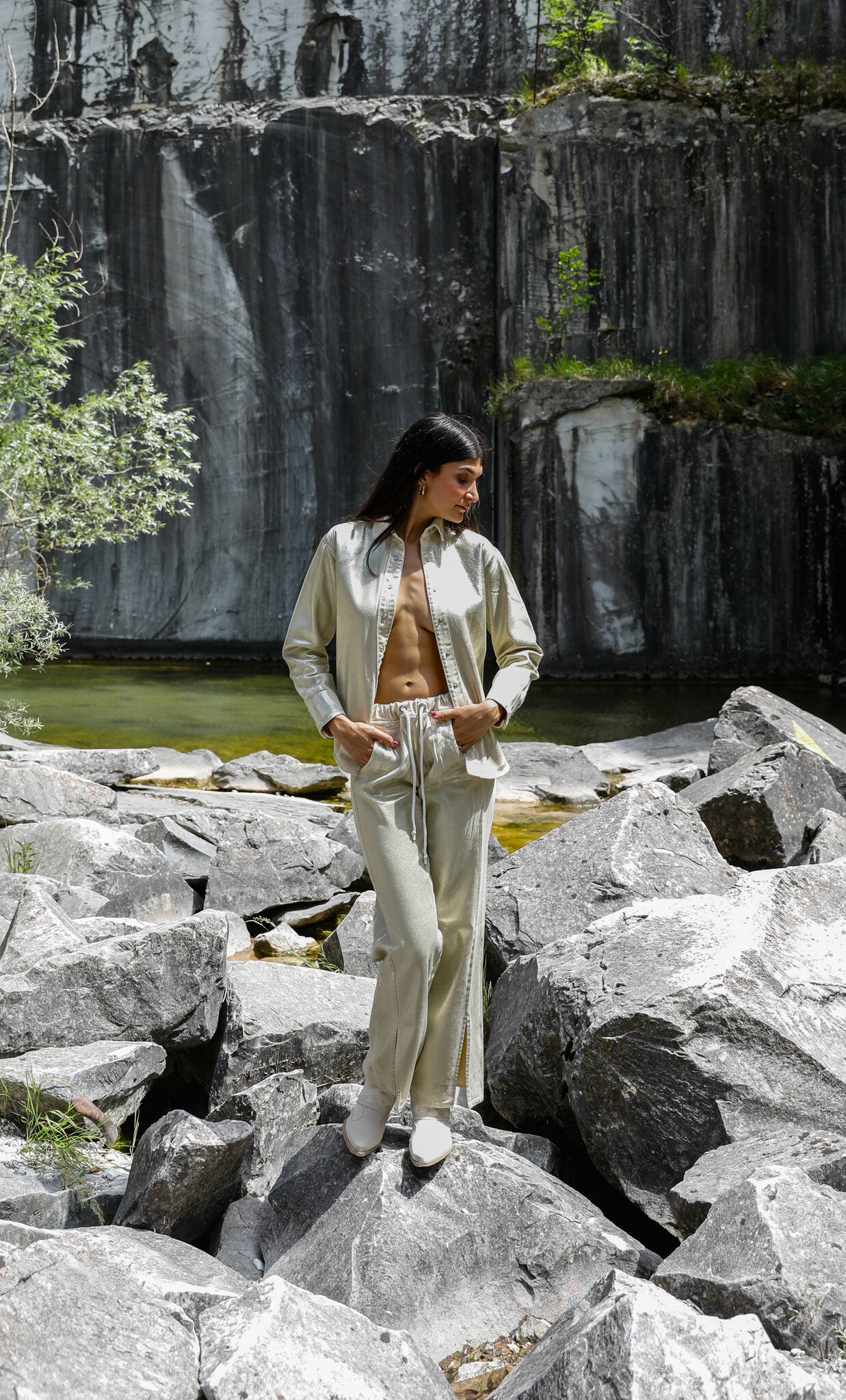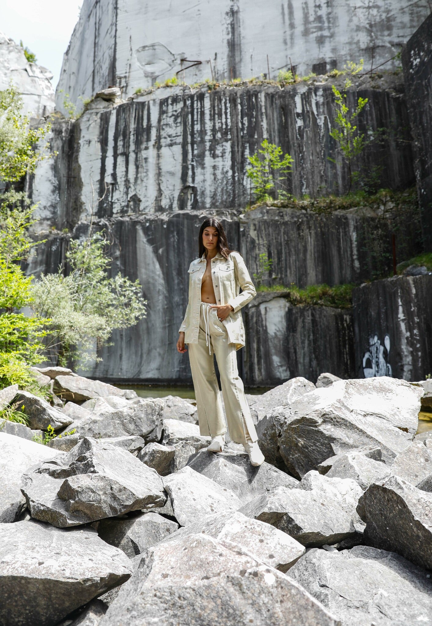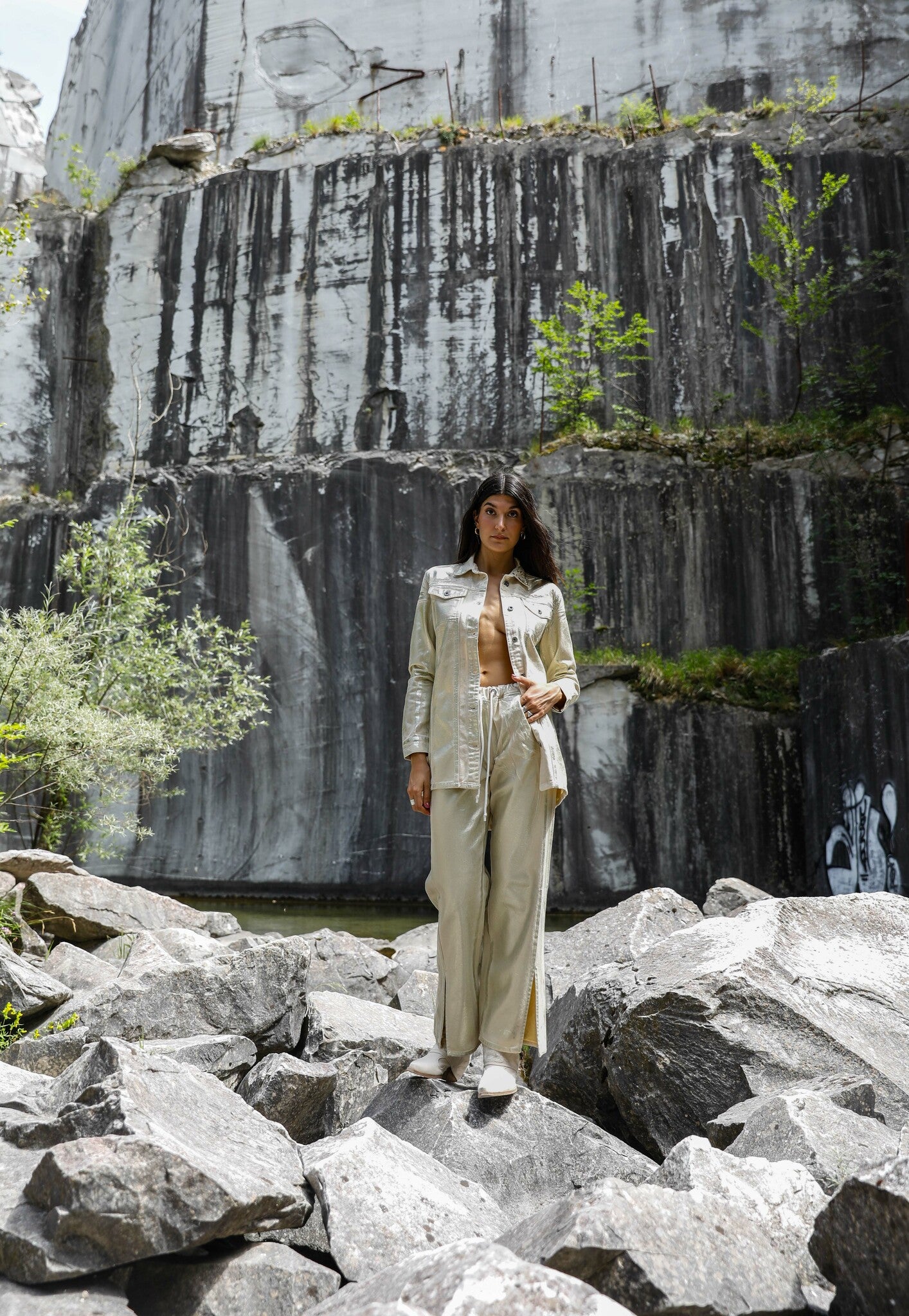 For your everyday look! The iridescent denim wide leg is designed for a low waist fit, elasticated waistband and drawstring with sides pockets at each leg and lateral slits for sexy heeled looks.