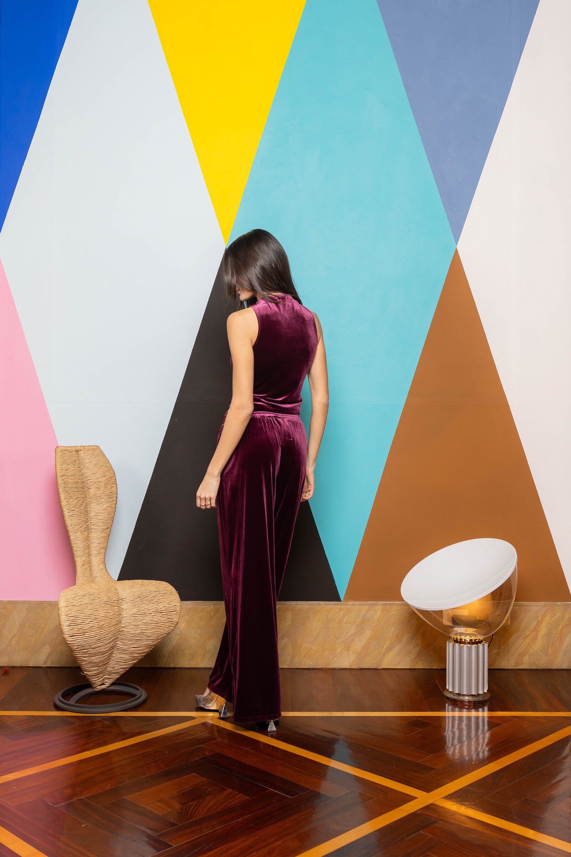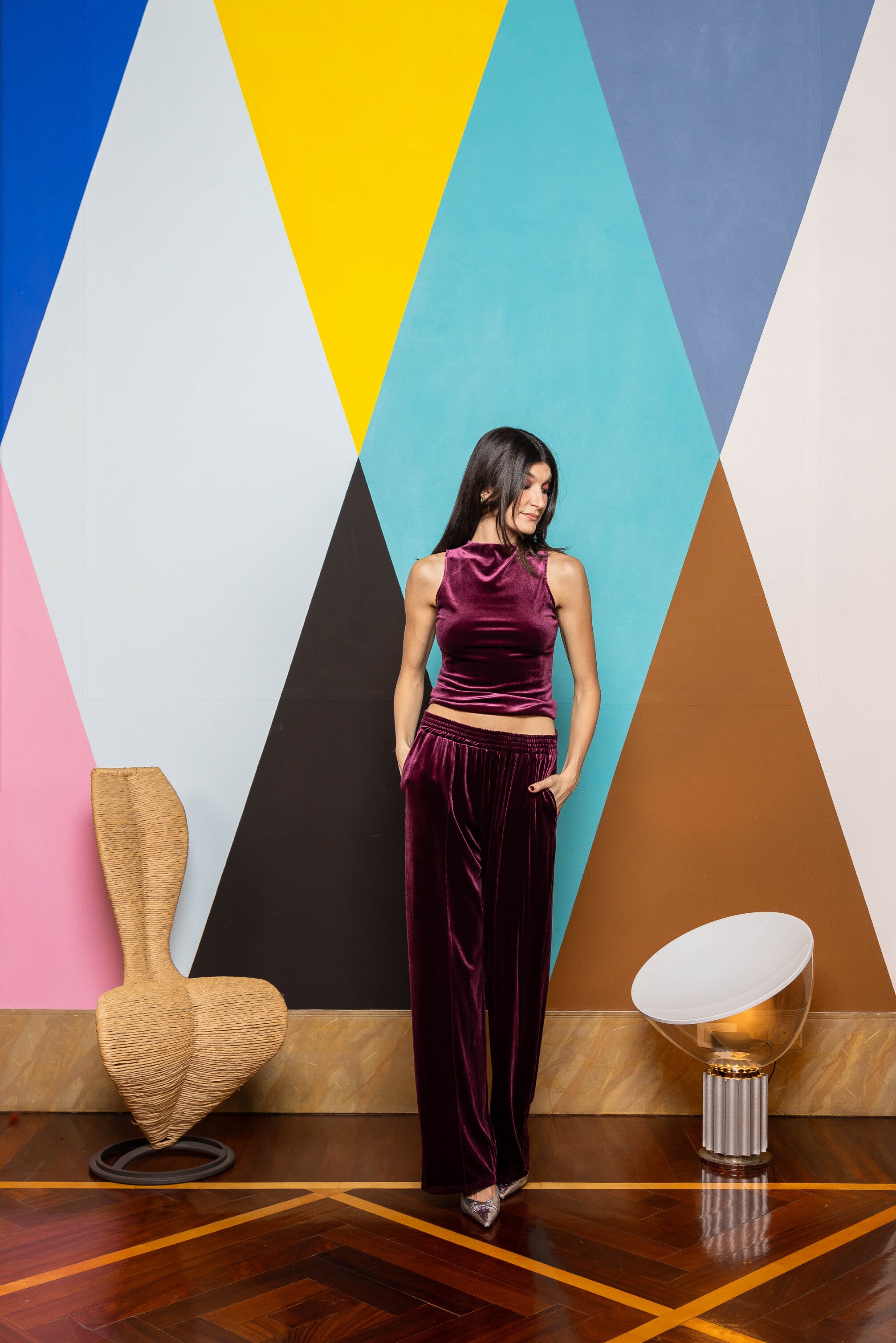 Our sequin velvet top. Soft and perfect to be matched with all our bottoms thanks to its versatile round neck.