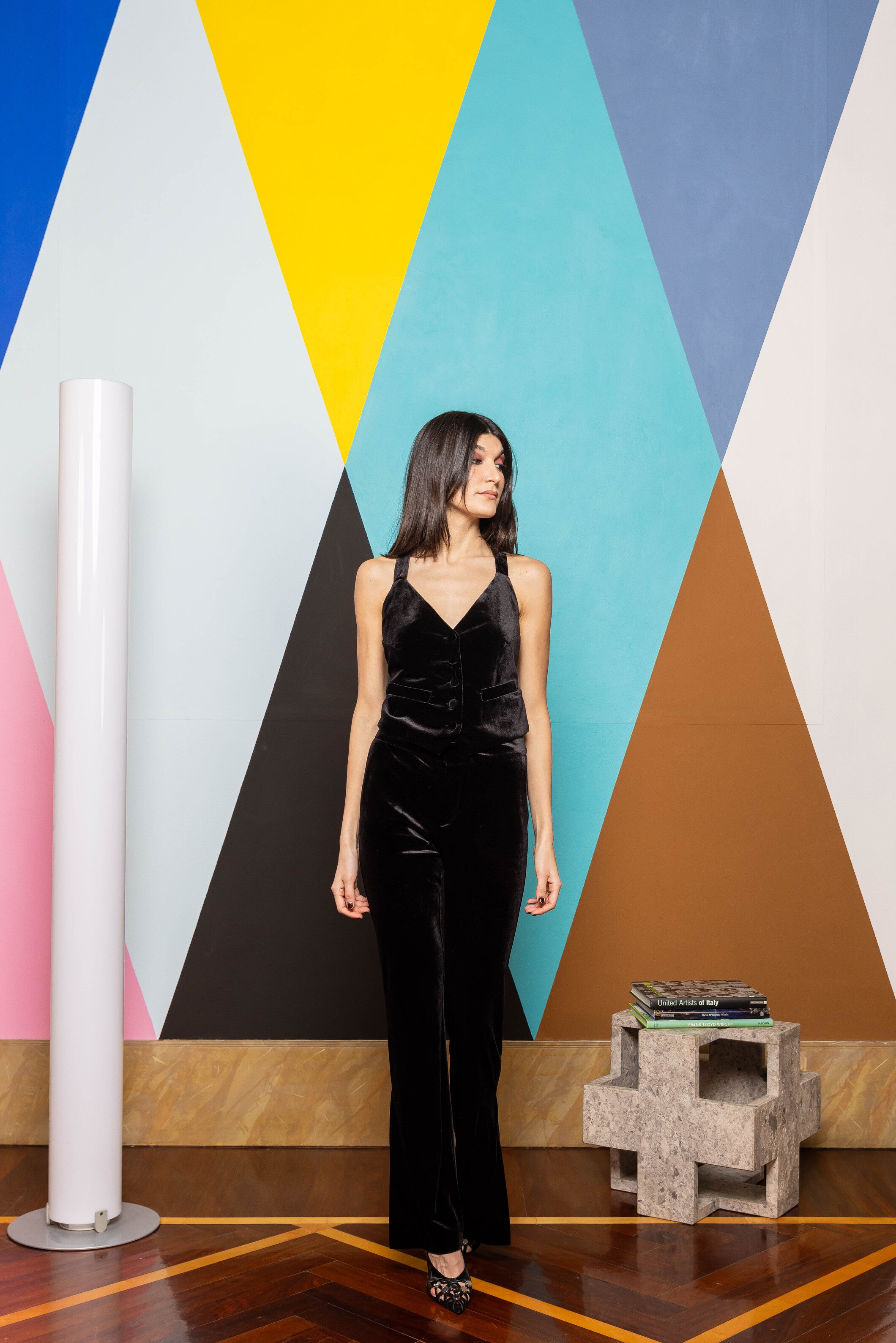 Our waistcoat, made in our premium velvet material and with metal detailing. Adjustable on the bac and with a v neck like.