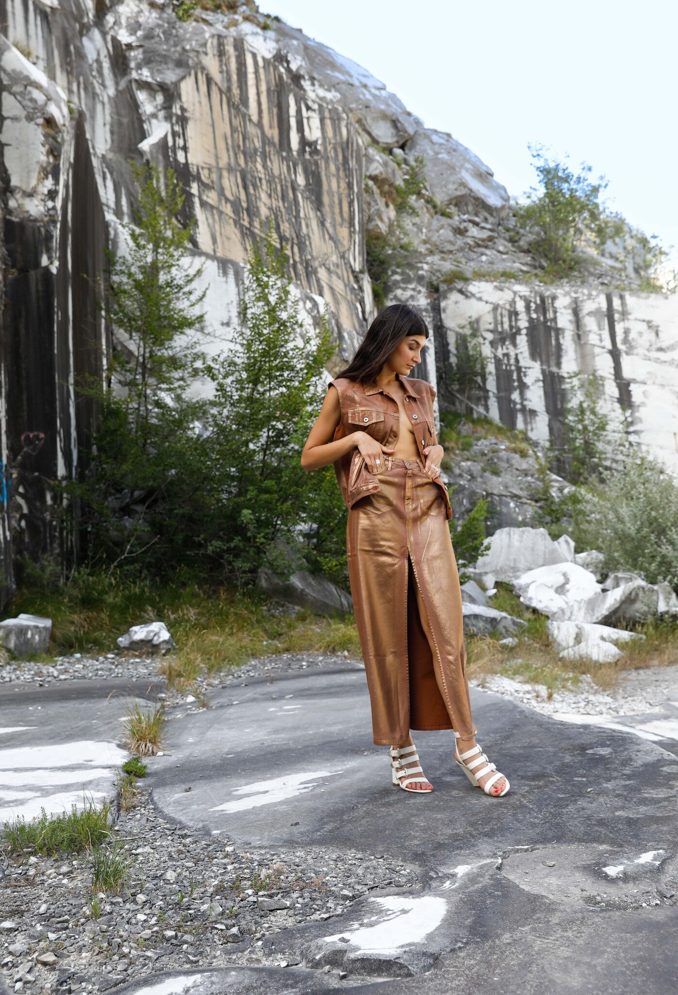 Iridescent denim maxi skirt with belt loops and button and fly closure with a maxi central slit to make it SEXY just as you like it!