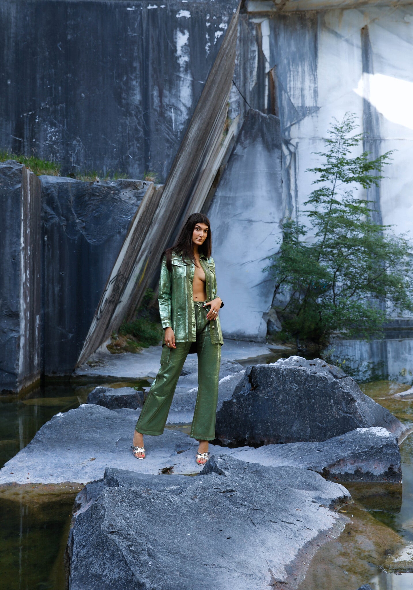 The classic trucker jacket reimagined in an oversized iridescent version. Wear it as a jacket over some baggy jeans or a mini skirt, but if you feel bold enough it also looks stunning as a mini dress with western necklaces and cowboy boots 💥