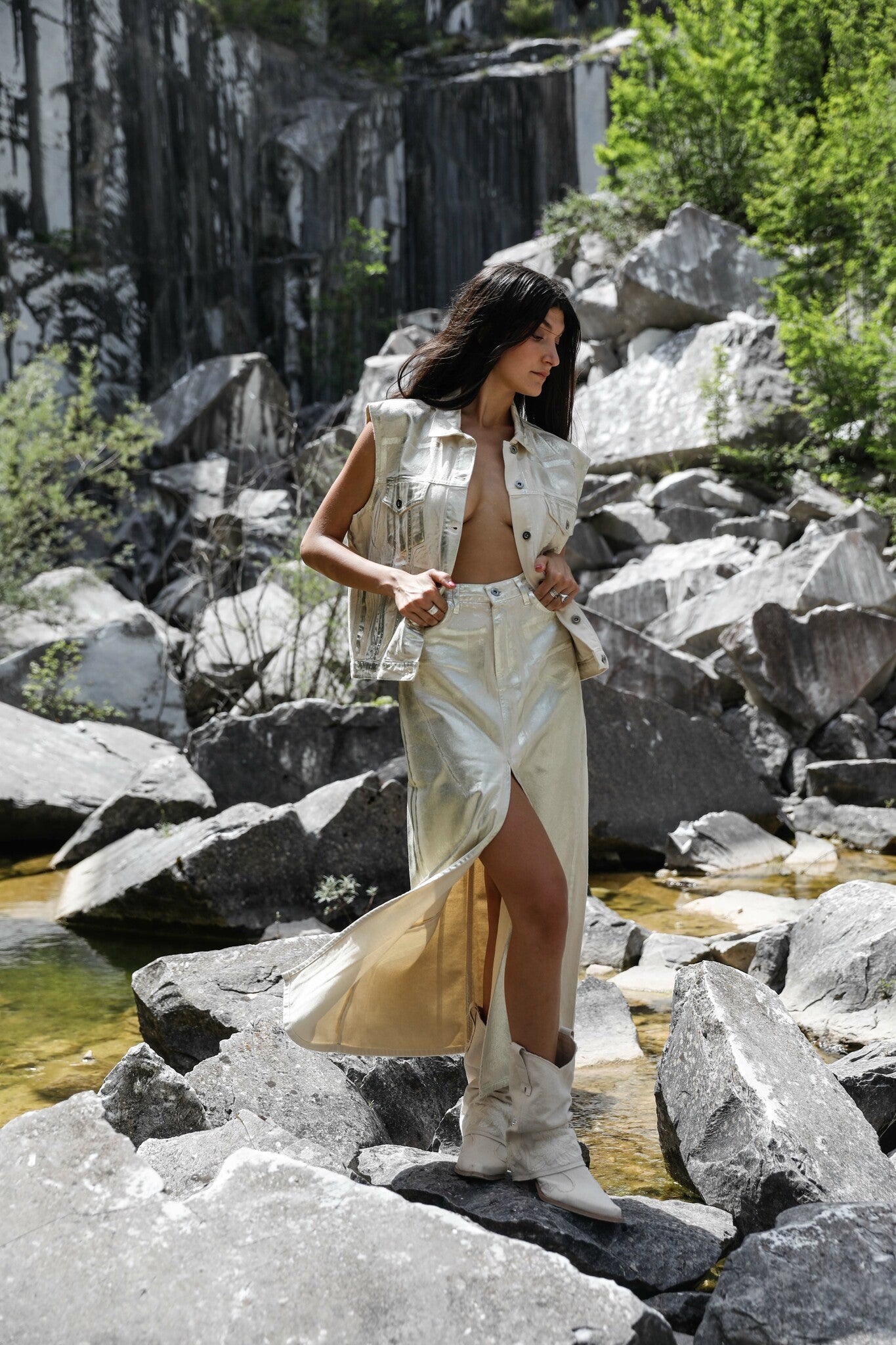 Oversized iridescent denim gilet with three central buttons, front and side pockets. Pair it to the denim cargos for the ultimate look!