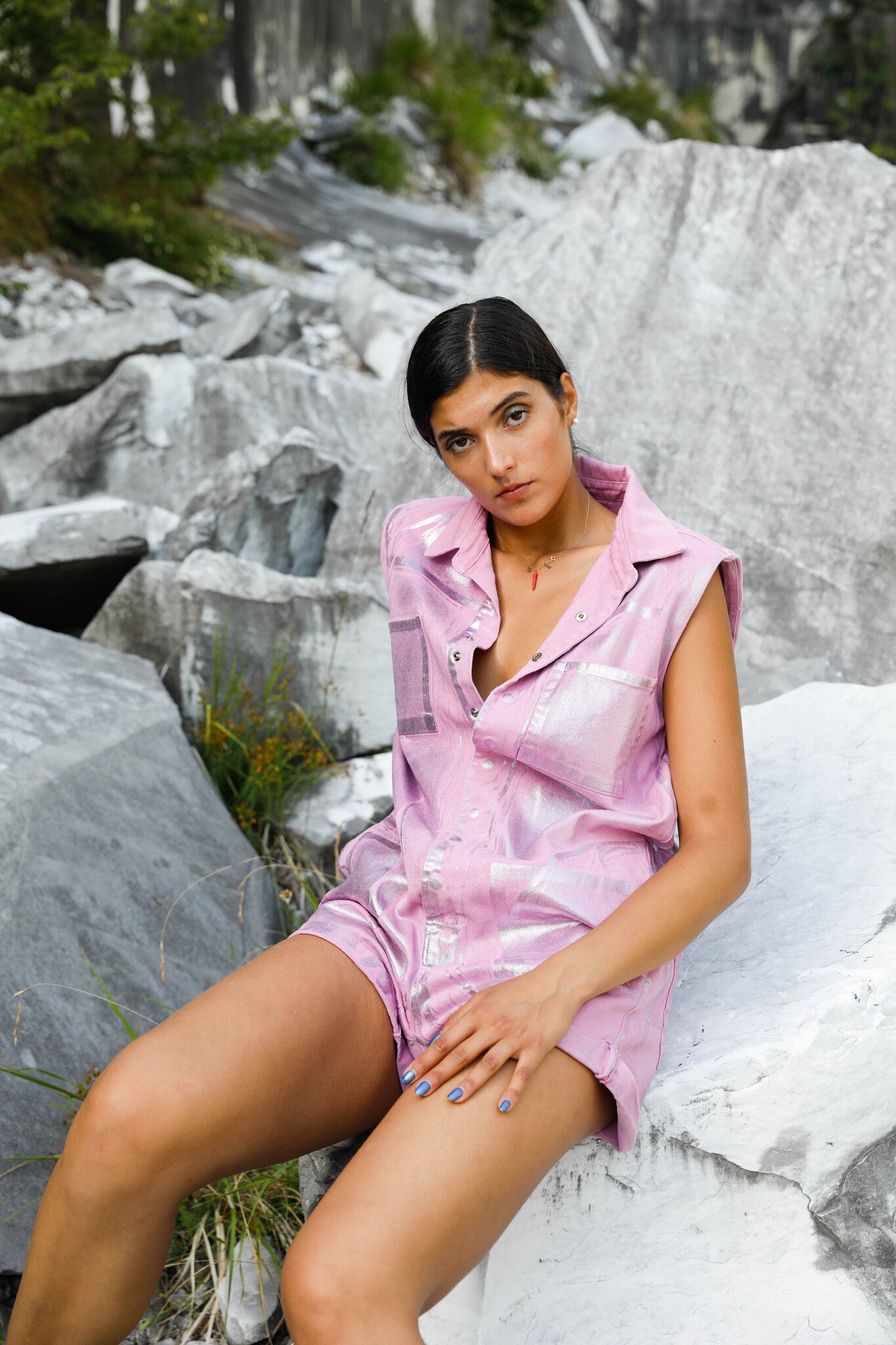 Iridescent playsuit in a durable cotton drill. It features a fitted body, drop waist, classic collar, two front pocket and back pockets. Rolled raw hem. Slight distressing.