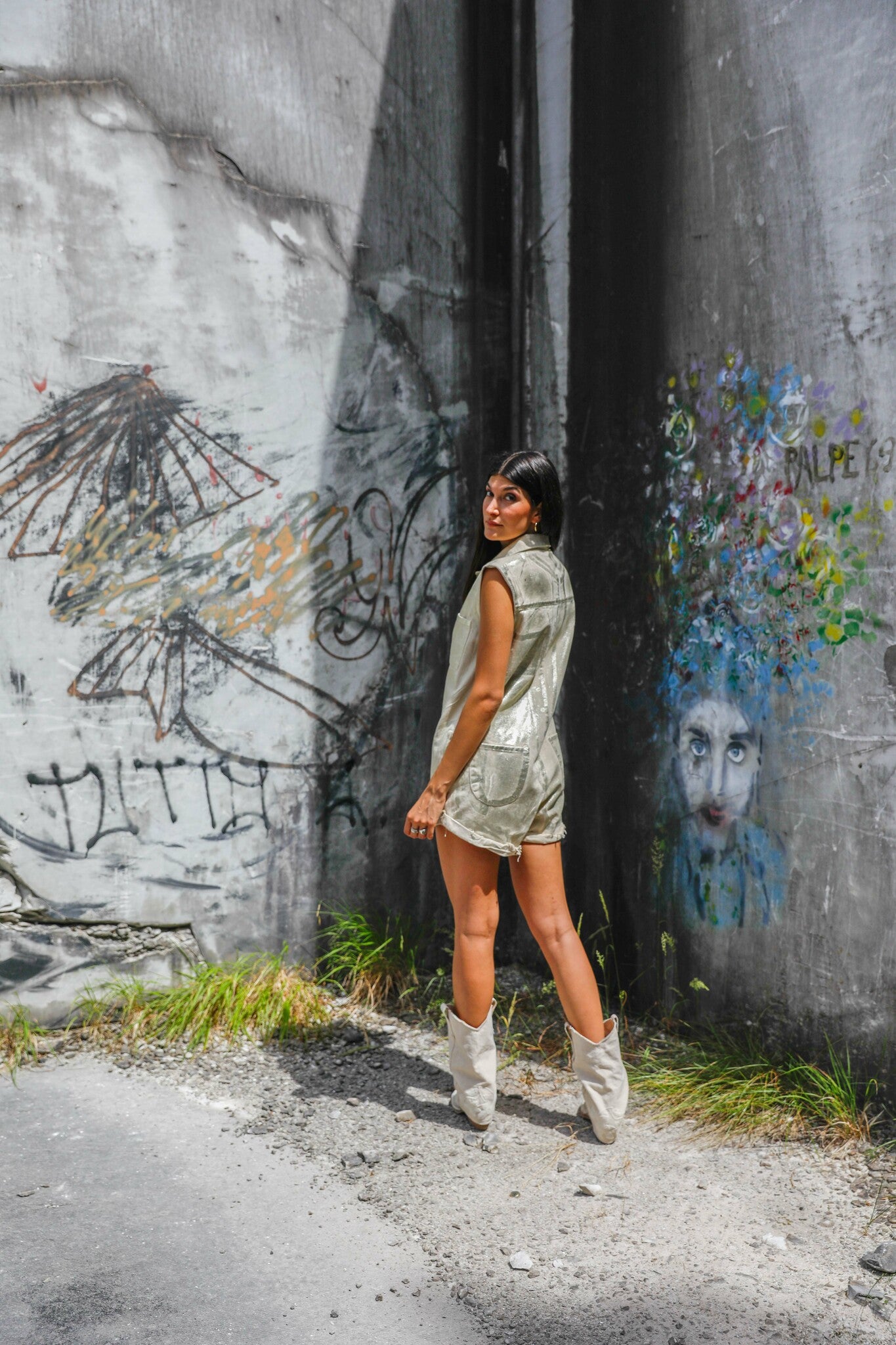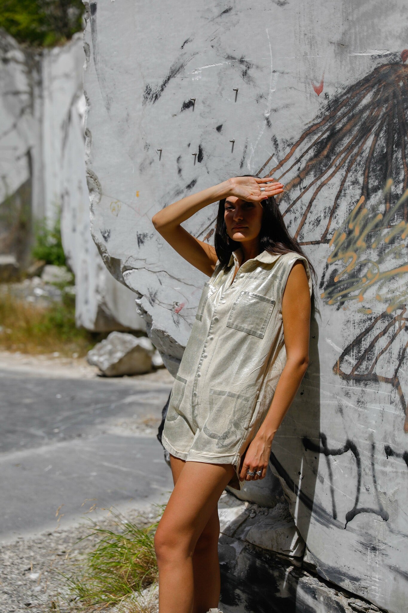 Iridescent playsuit in a durable cotton drill. It features a fitted body, drop waist, classic collar, two front pocket and back pockets. Rolled raw hem. Slight distressing.