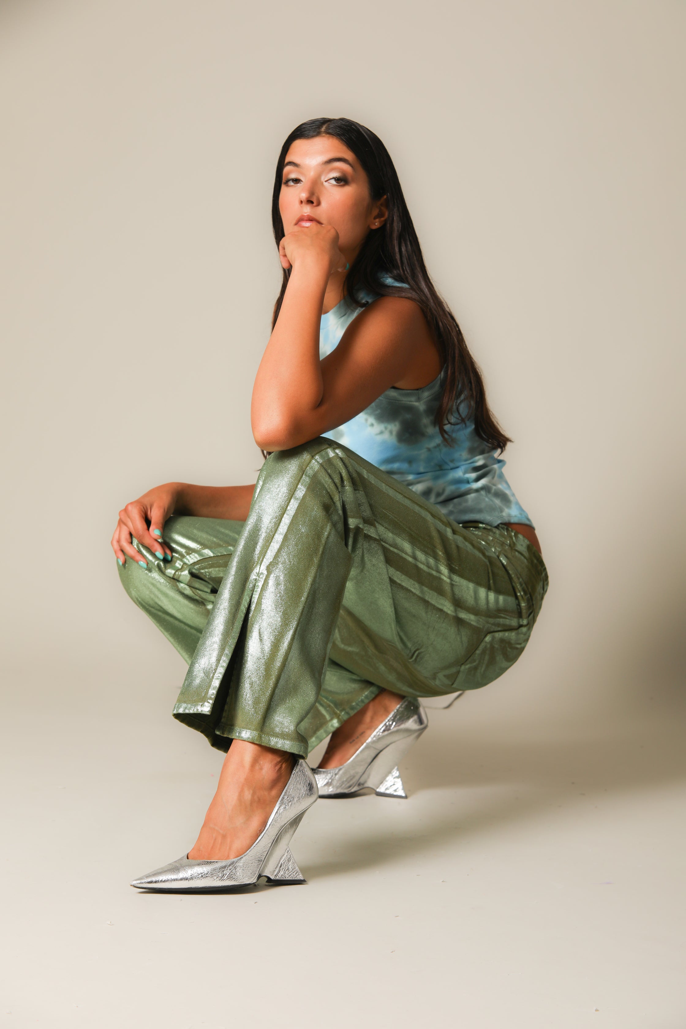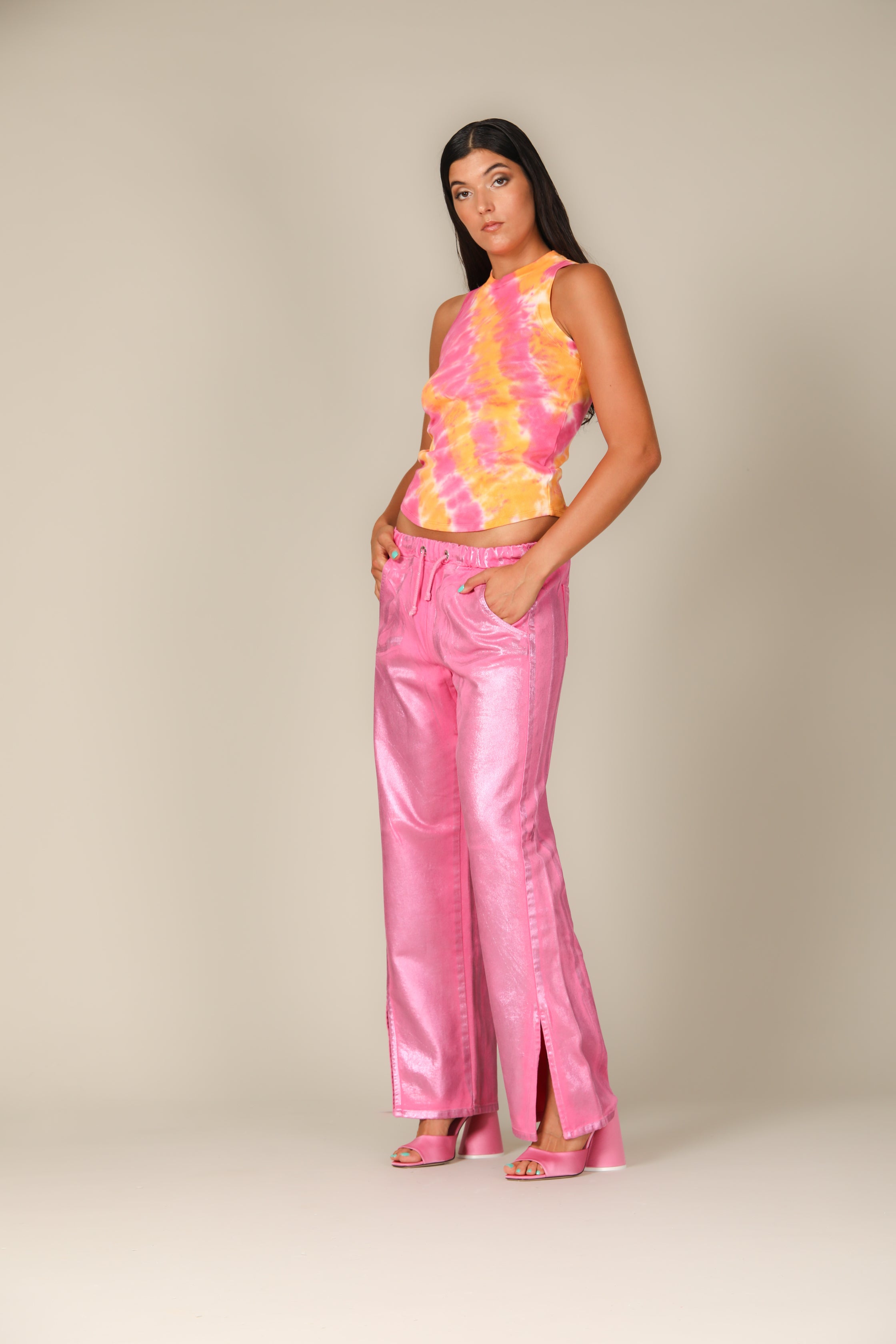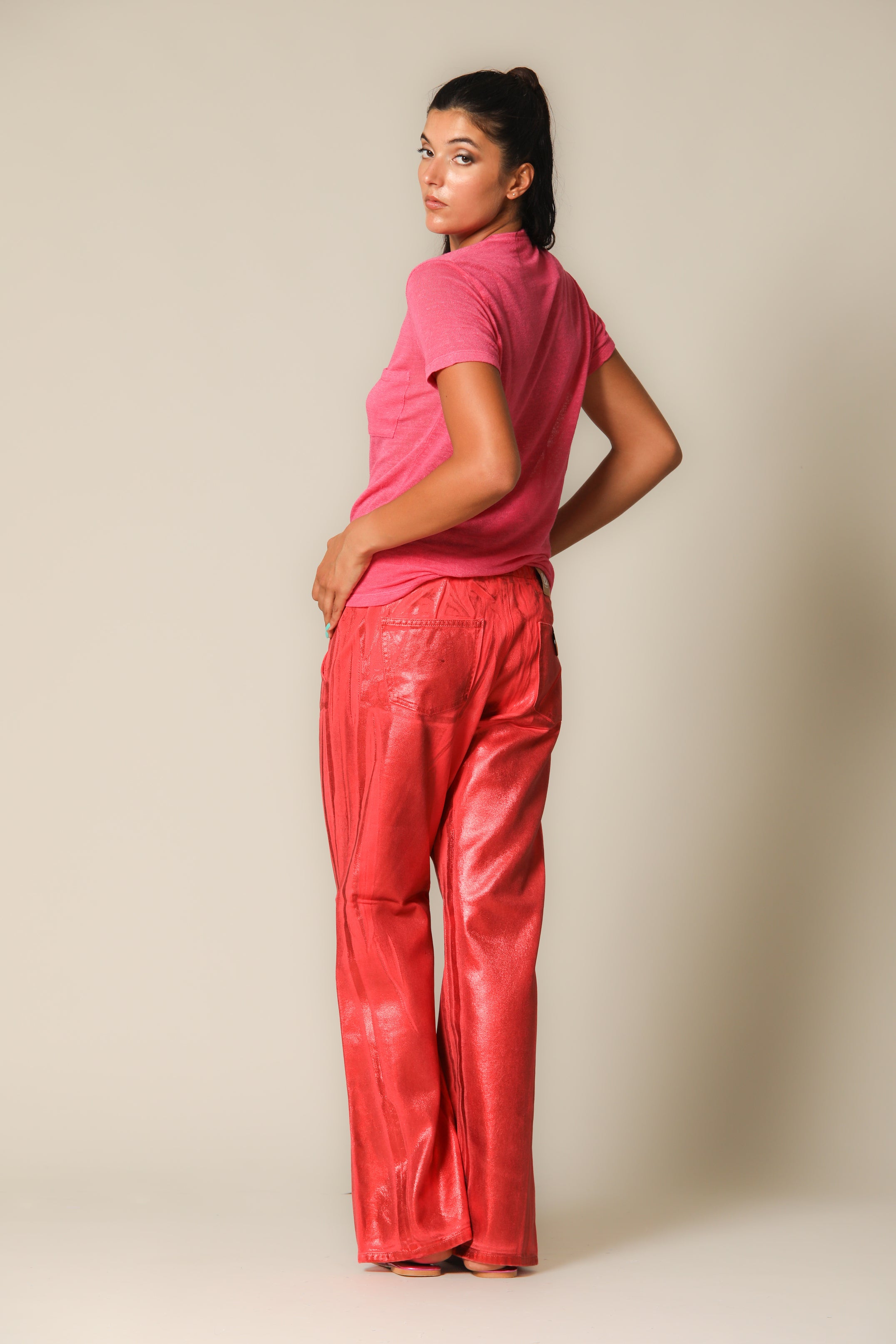 For your everyday look! The iridescent denim wide leg is designed for a low waist fit, elasticated waistband and drawstring with sides pockets at each leg and lateral slits for sexy heeled looks.