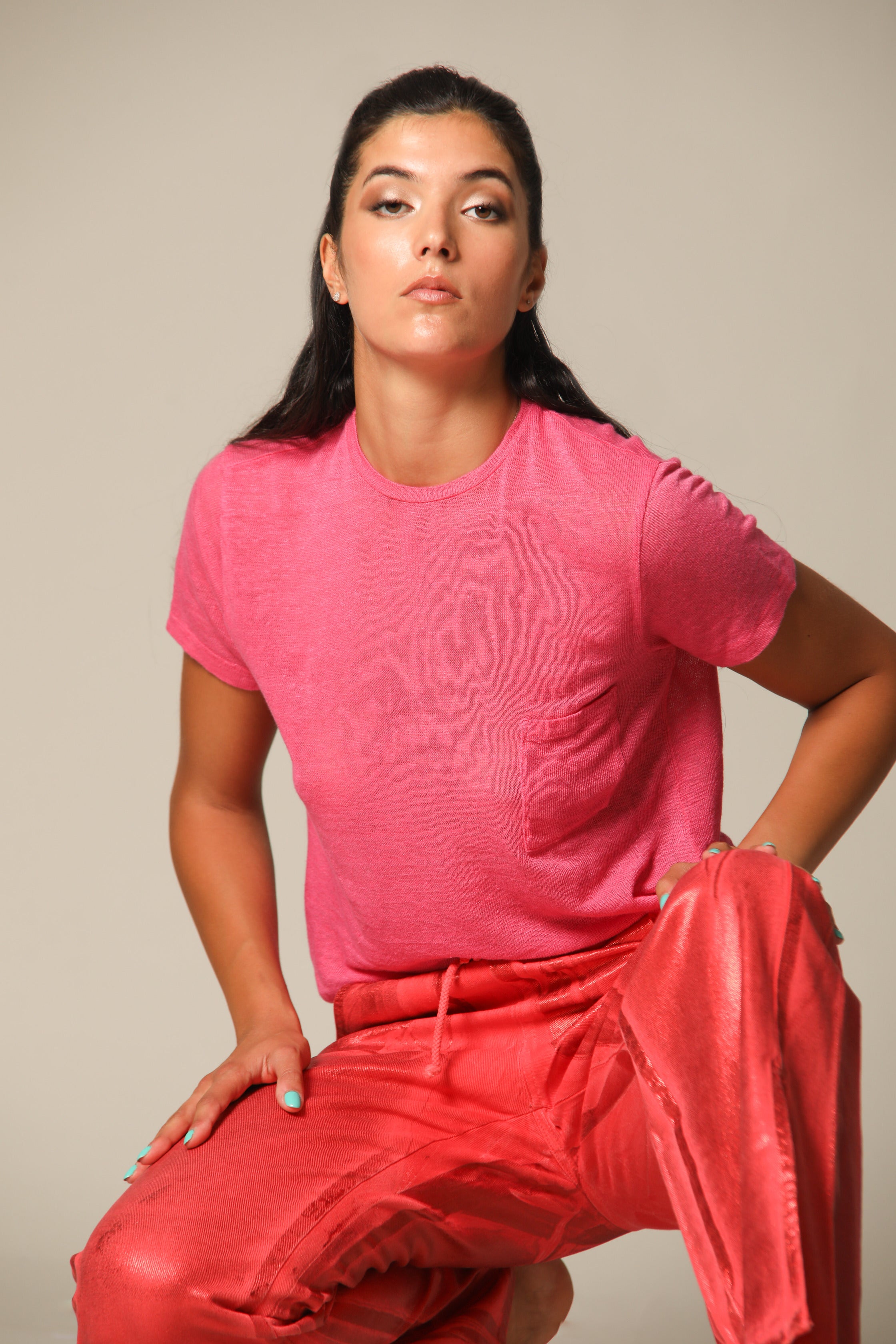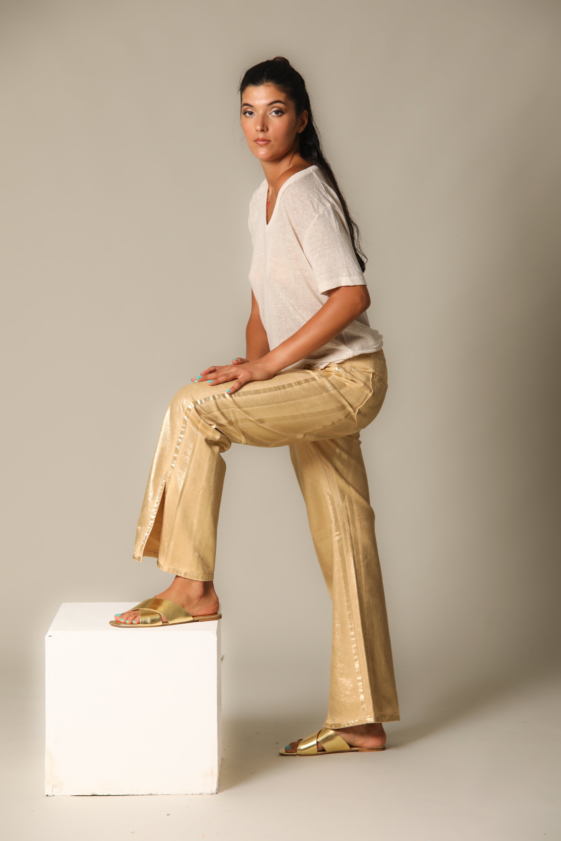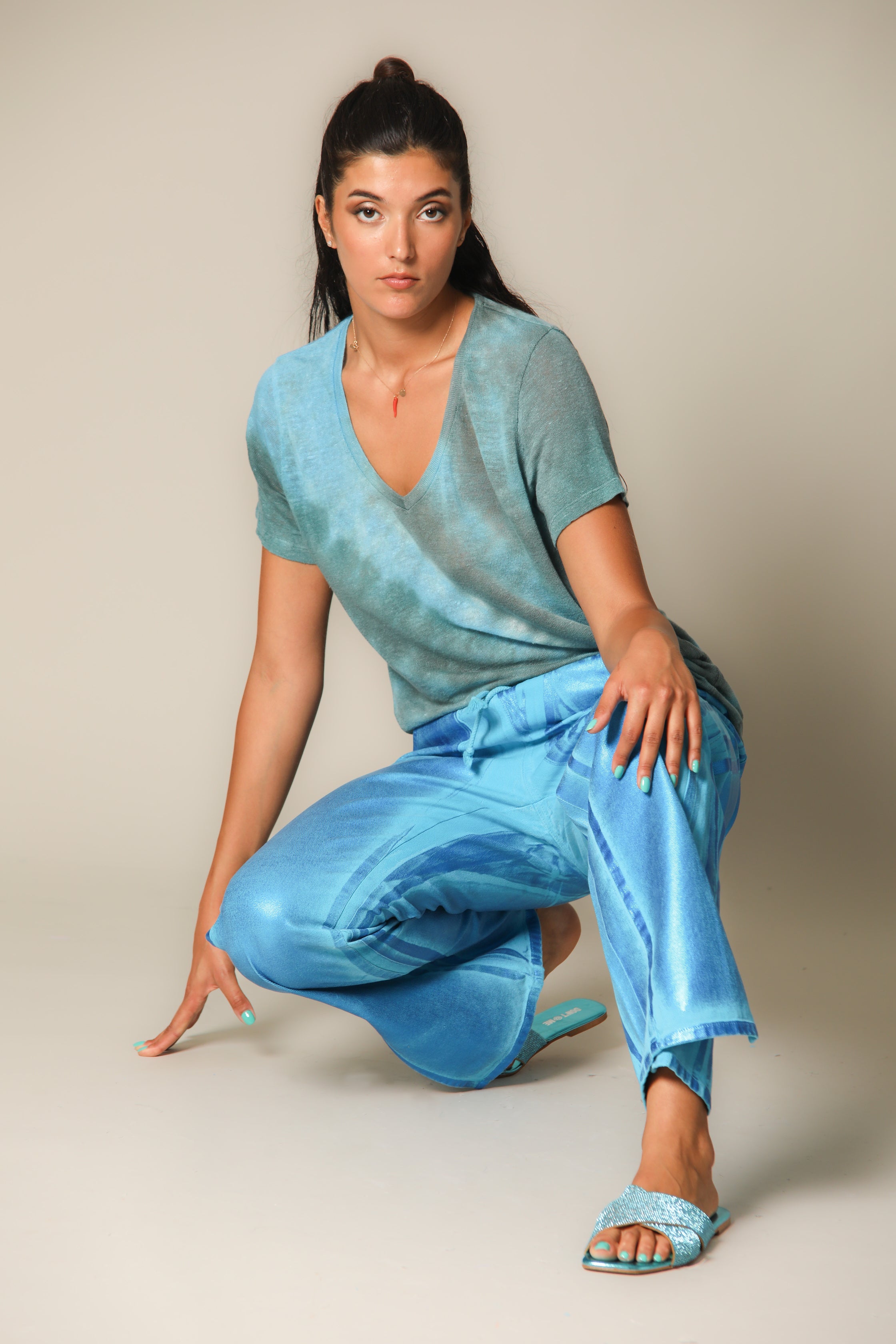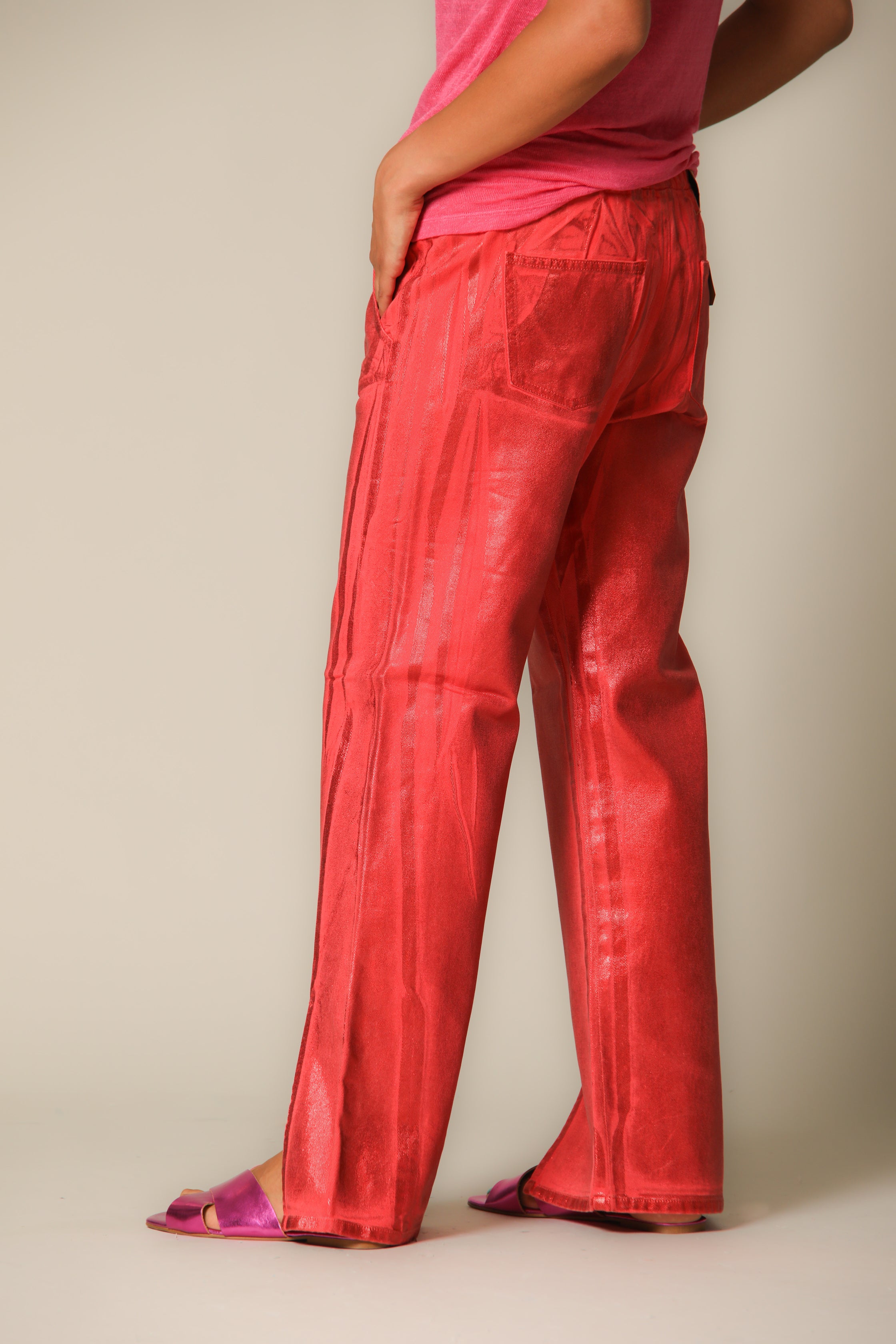 For your everyday look! The iridescent denim wide leg is designed for a low waist fit, elasticated waistband and drawstring with sides pockets at each leg and lateral slits for sexy heeled looks.