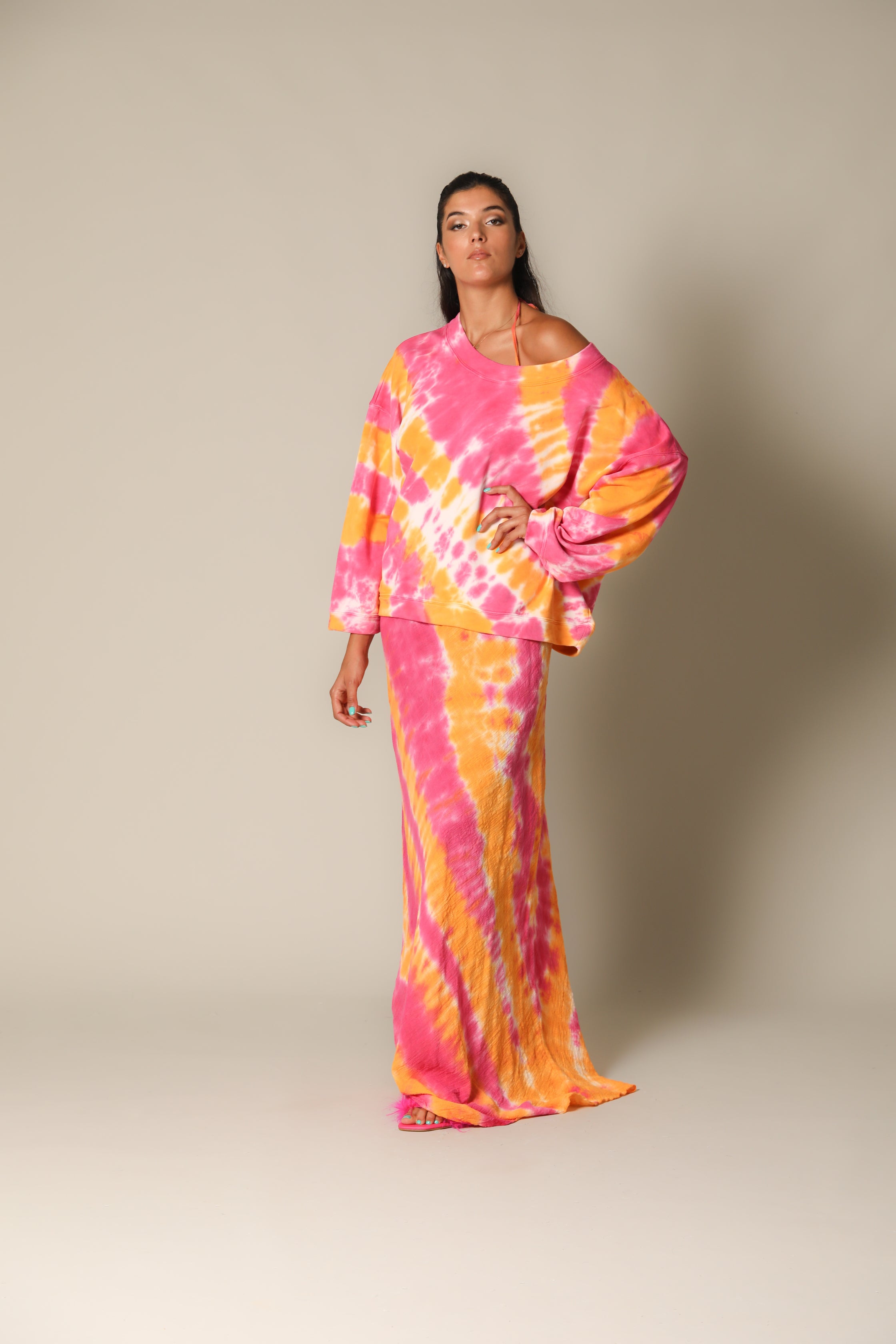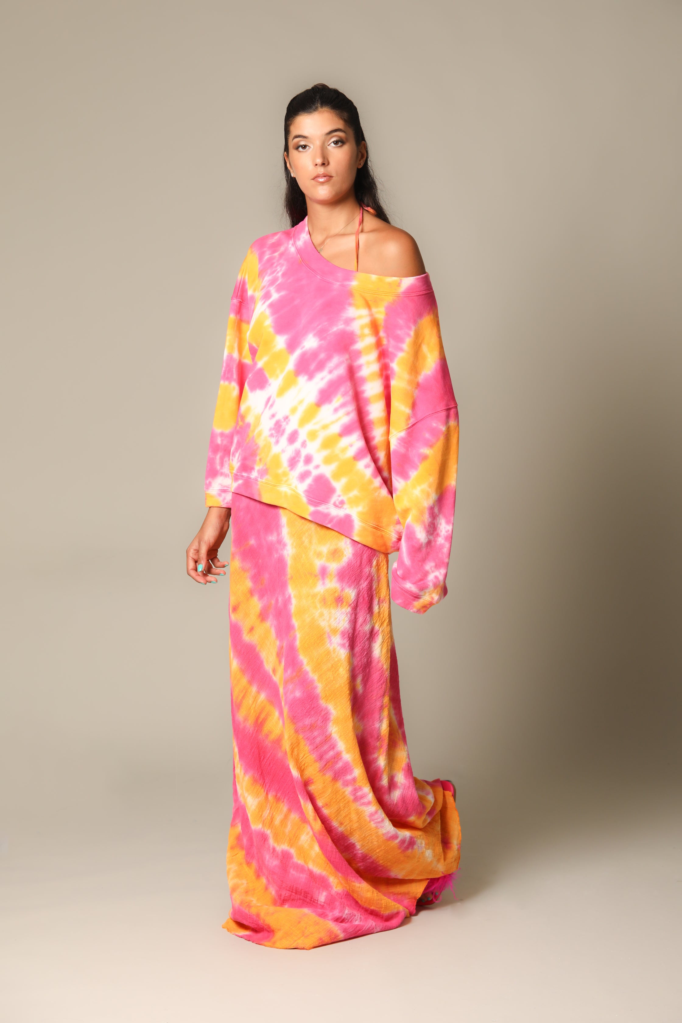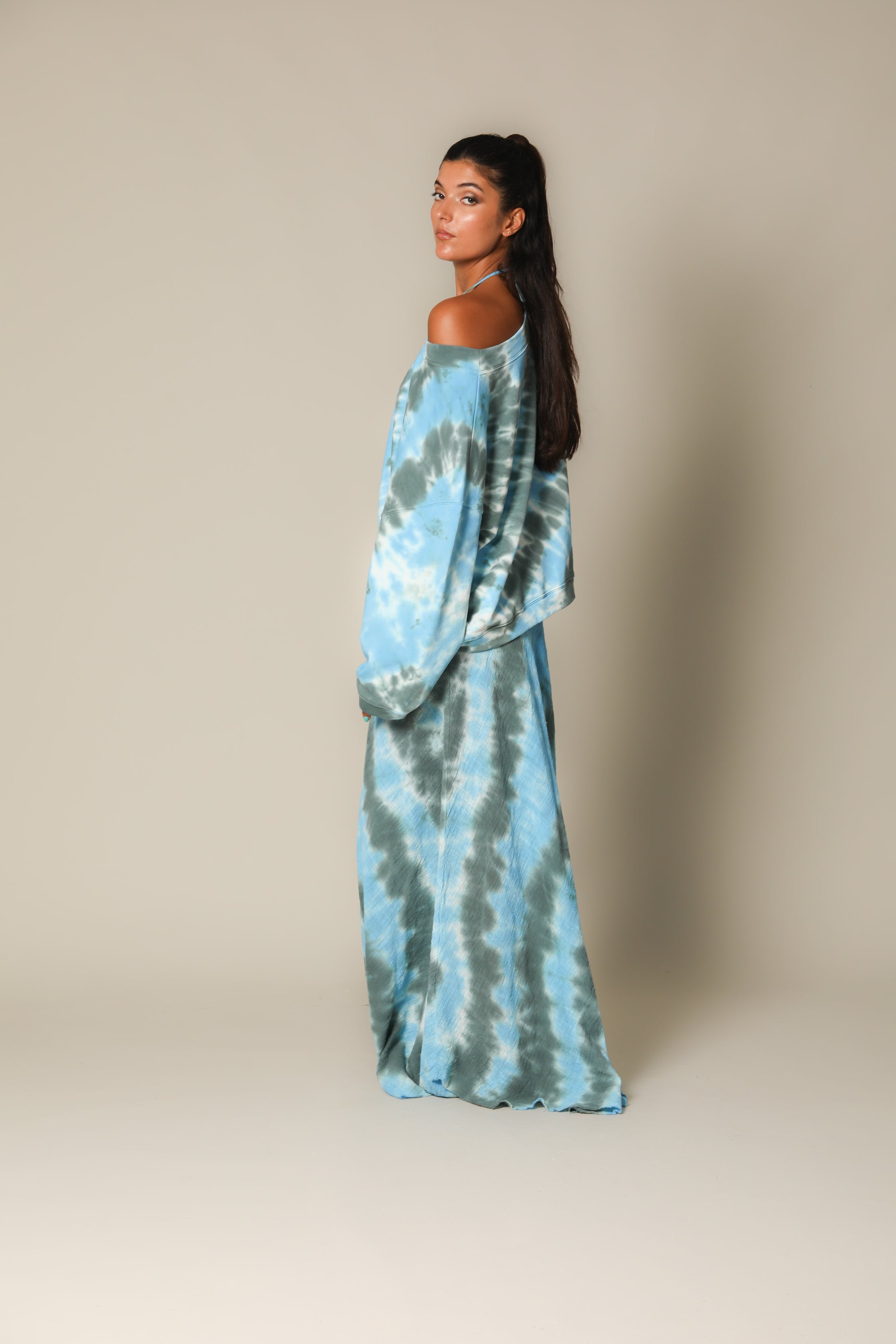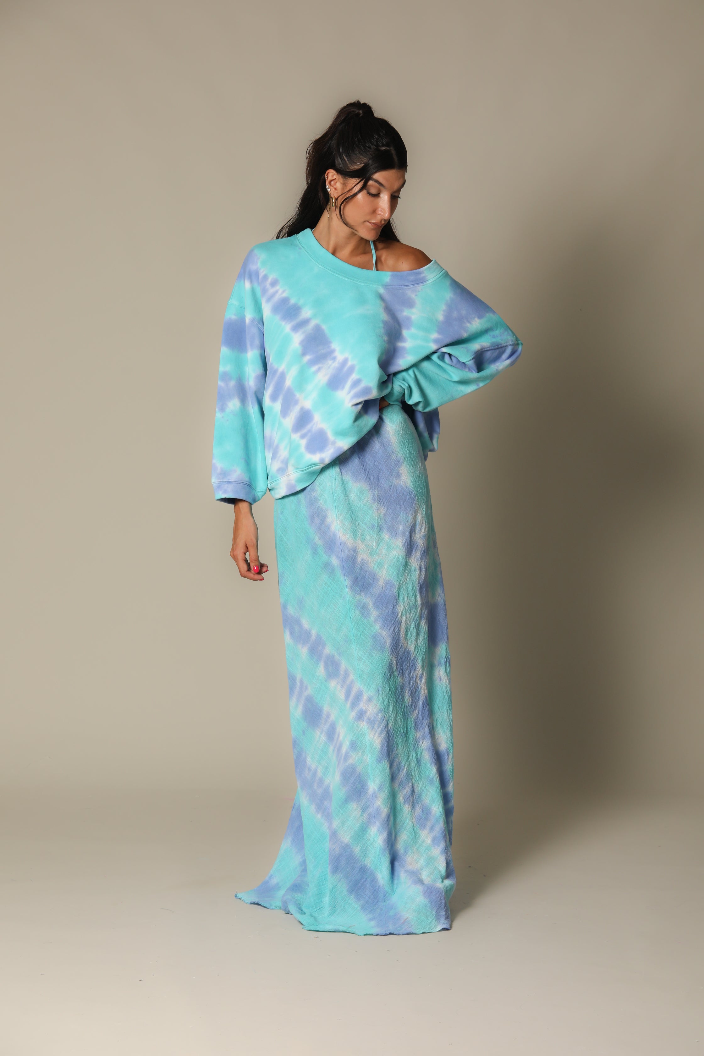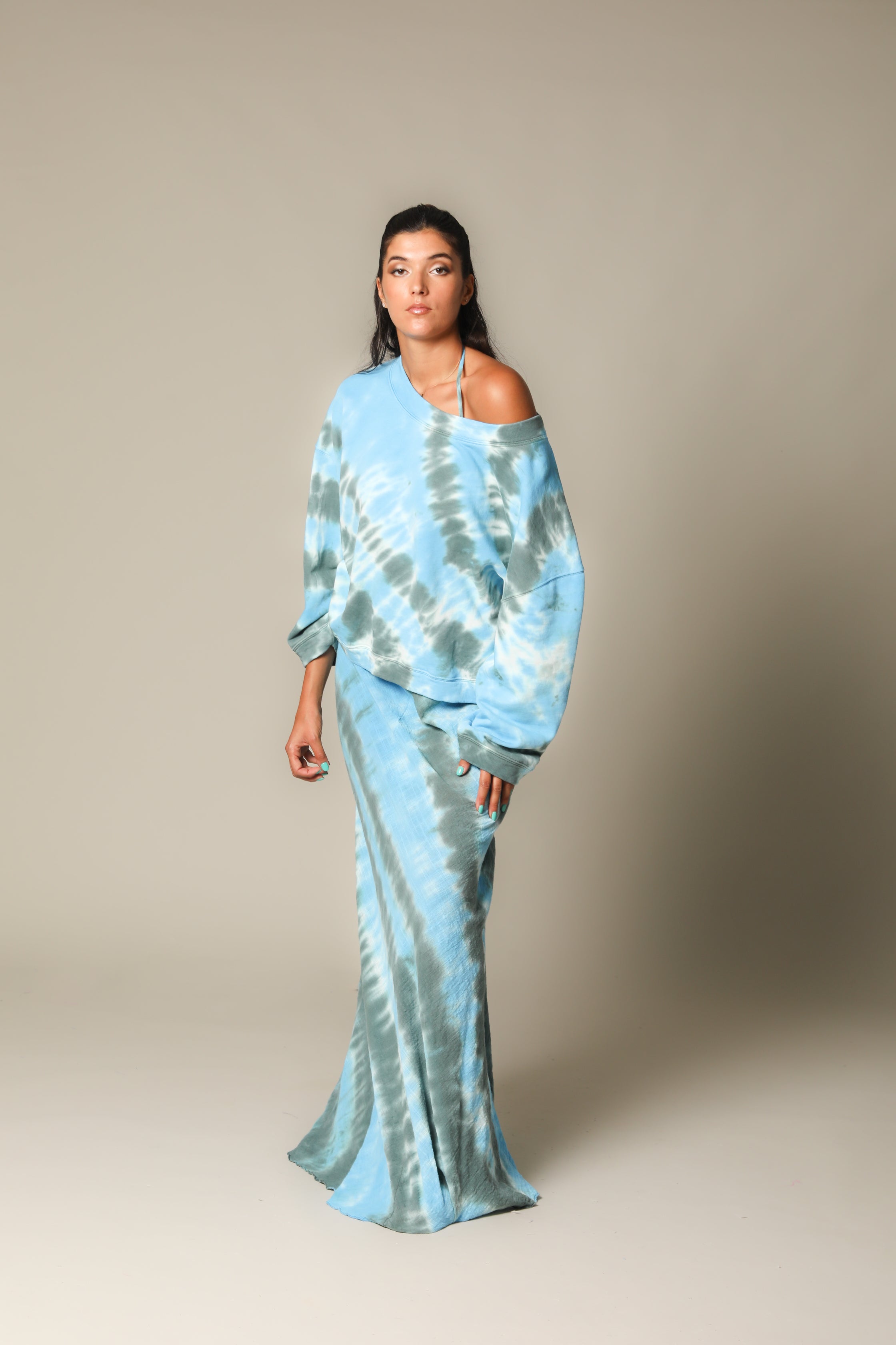 Our new sweatshirt with its oversized crewneck to be worn with shoulders out. Perfect matched with our sweatpants but also worn over our maxi dresses.