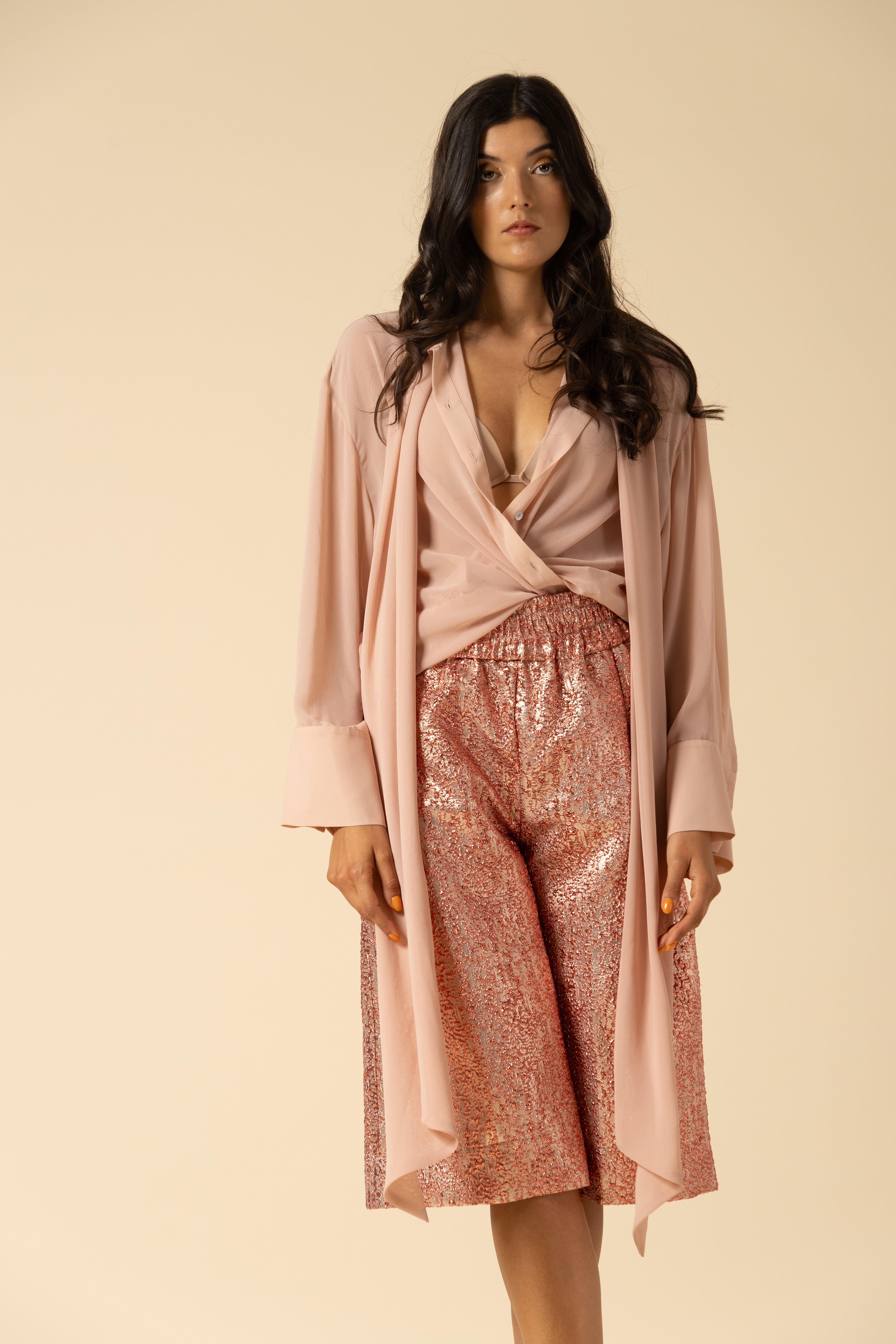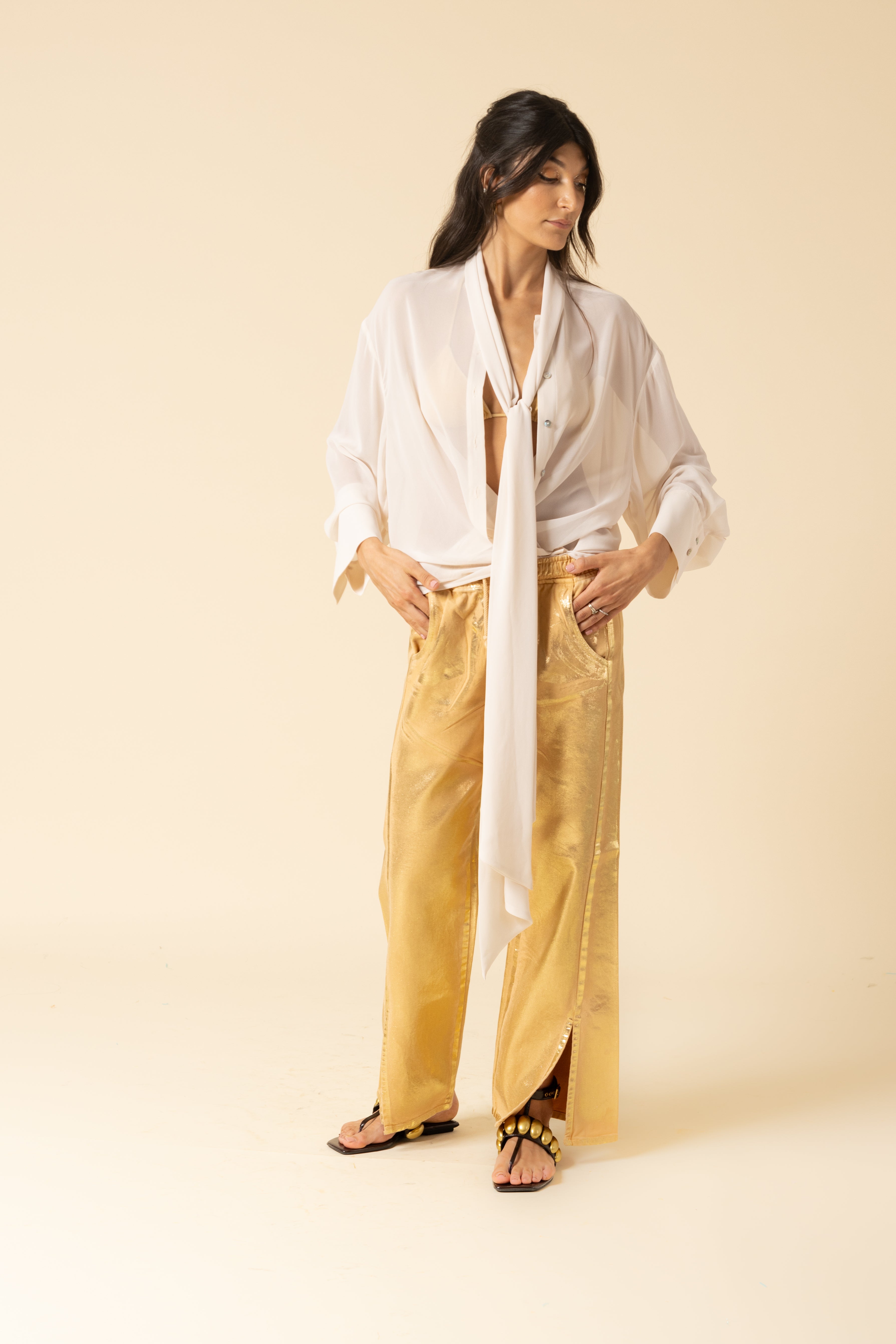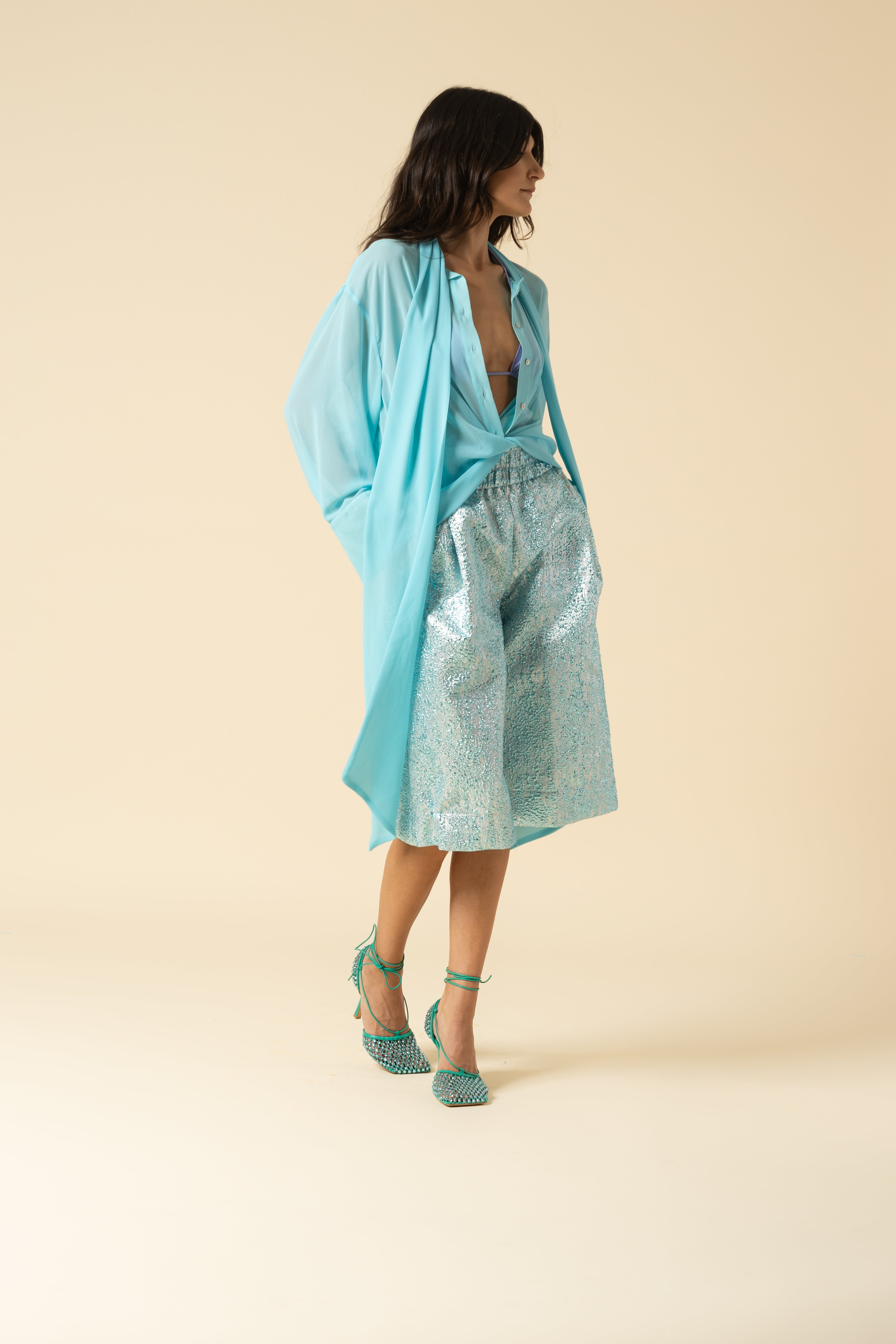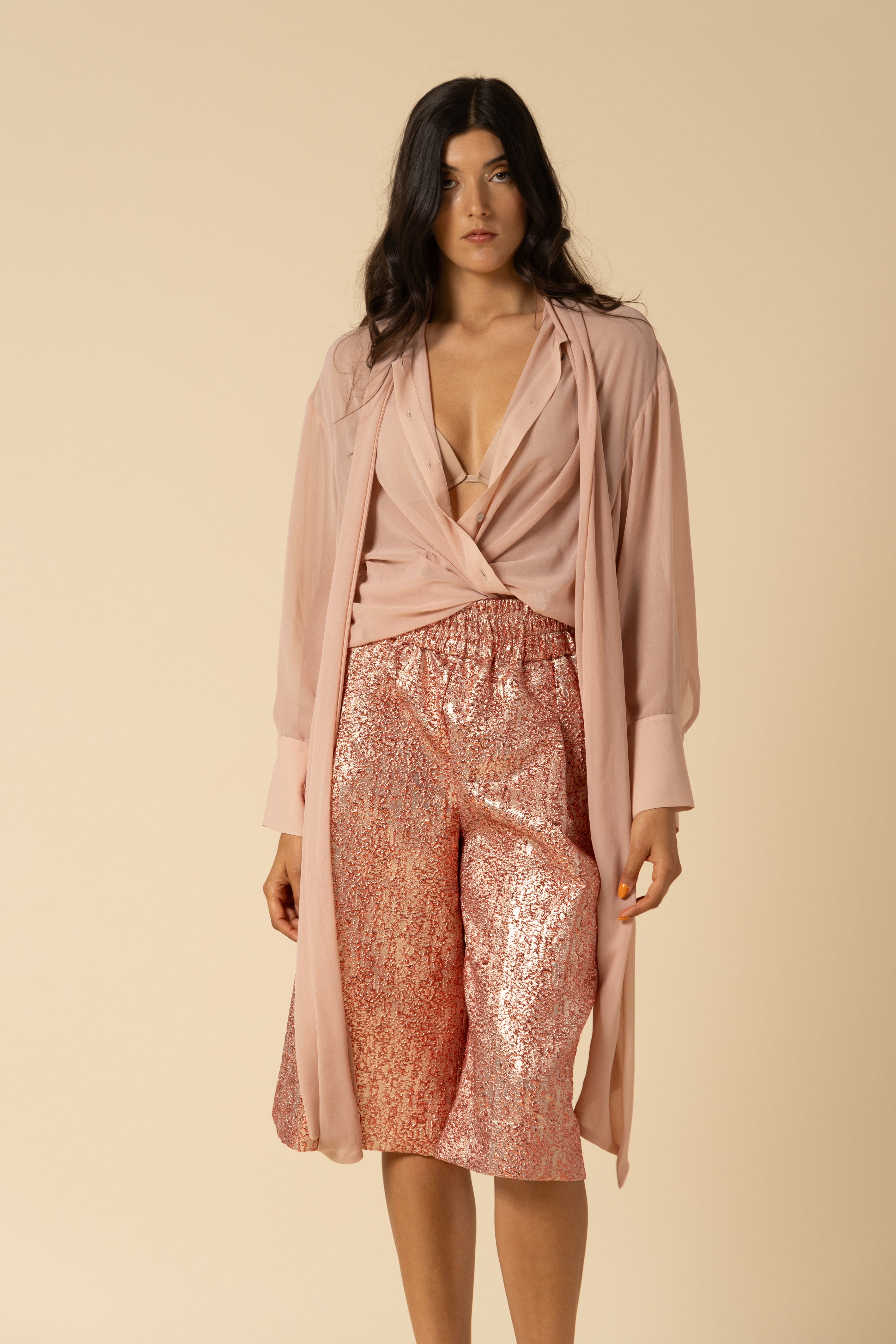Oversized shirt in georgette. Bow tie closure and mini button up detail.