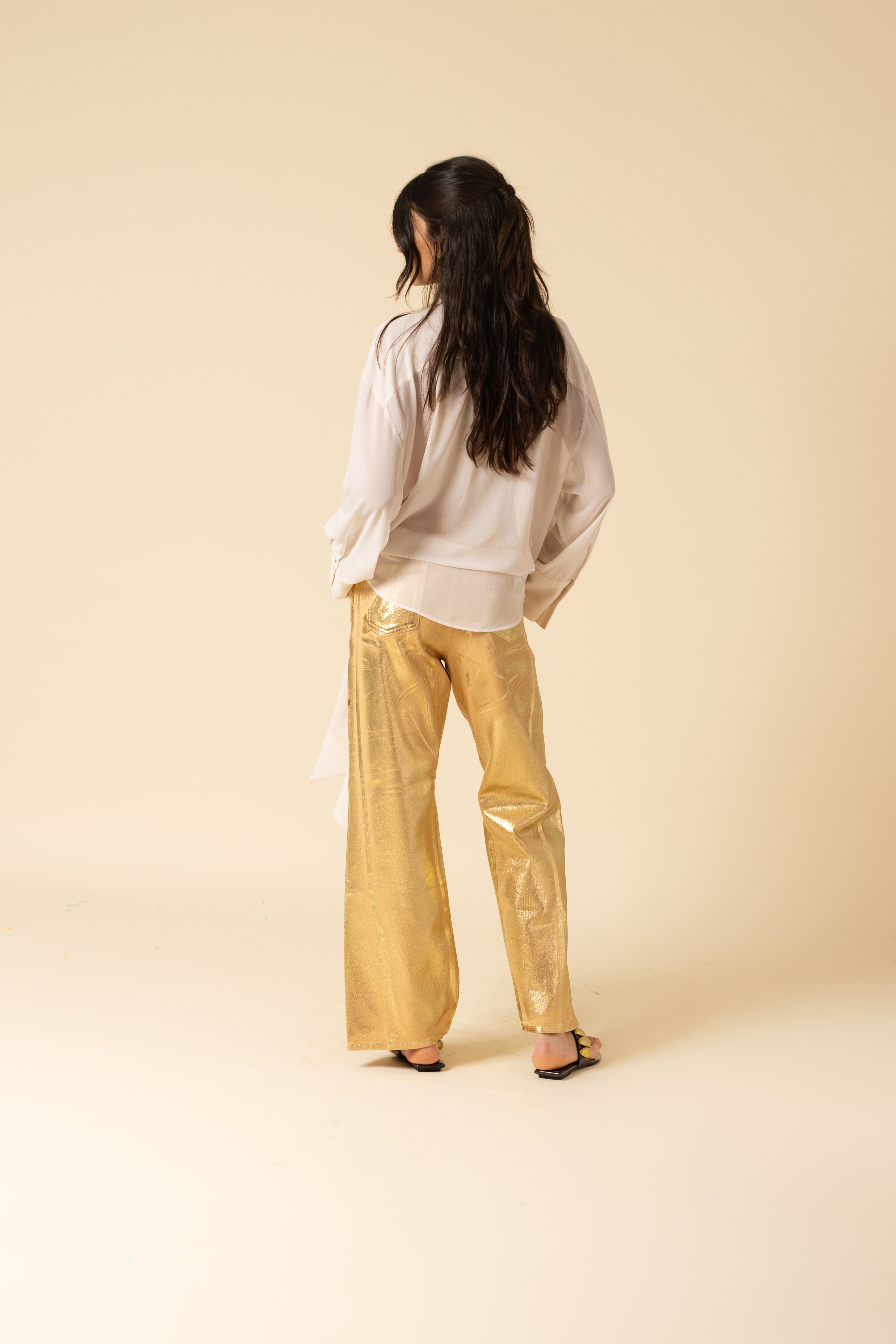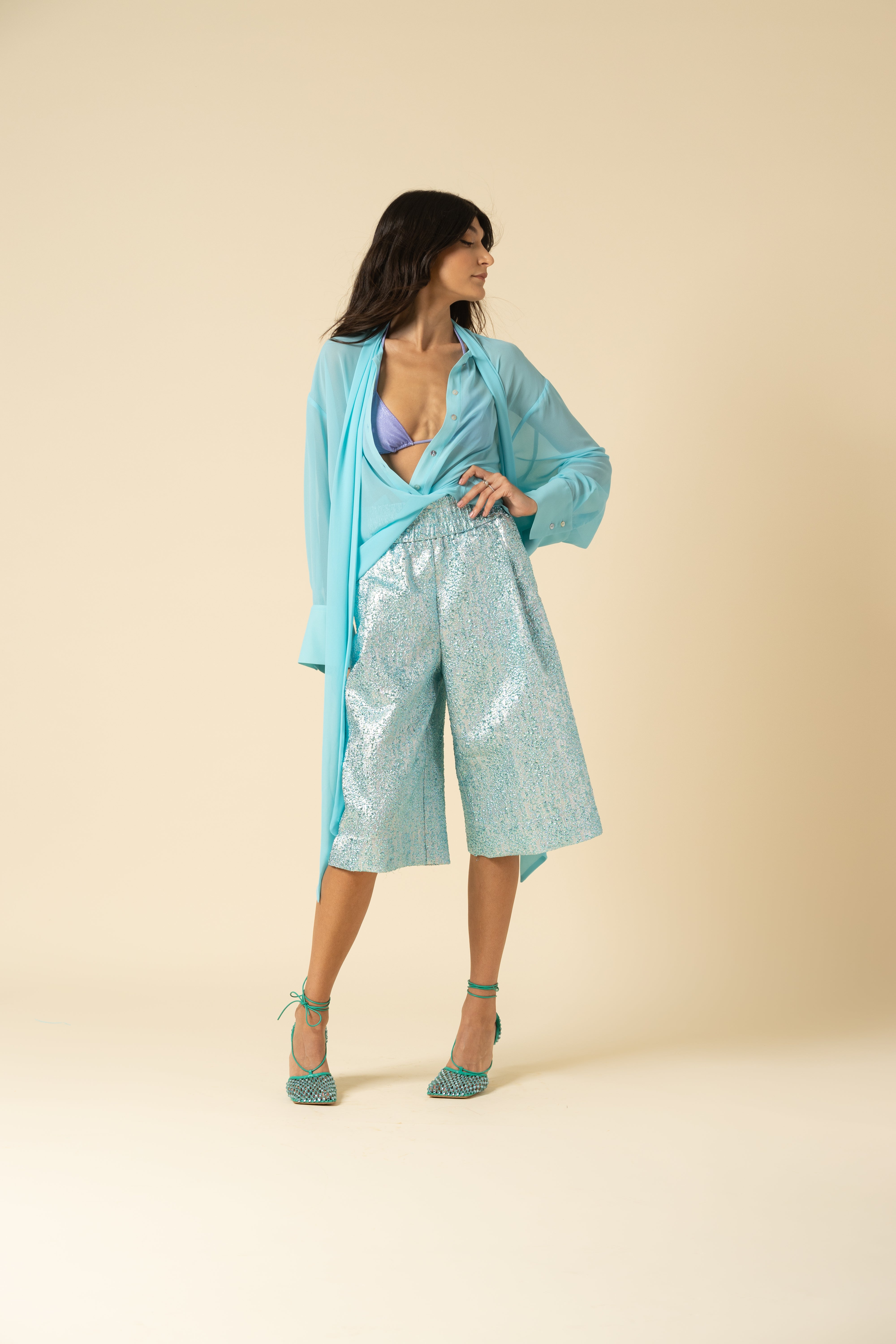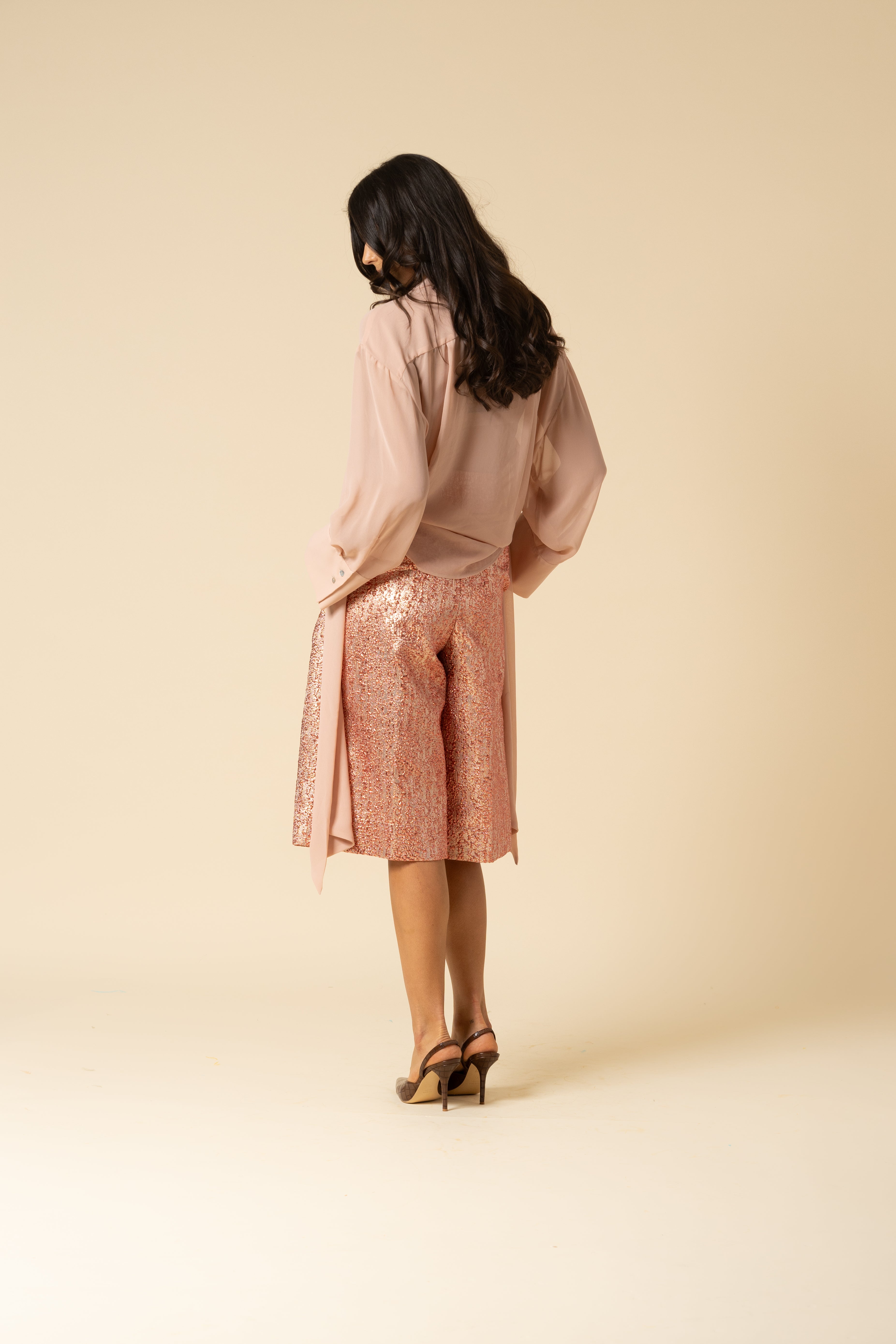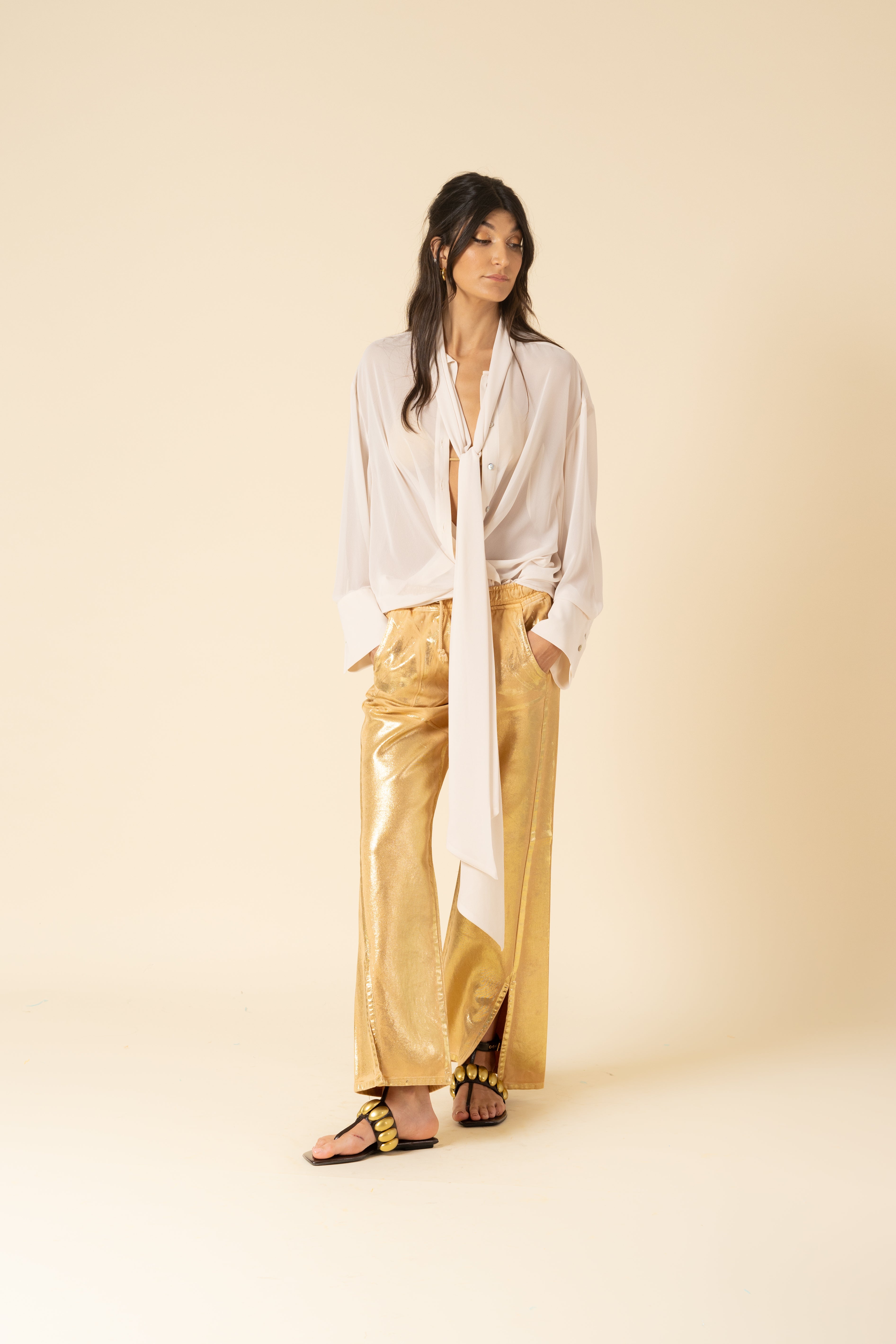 Oversized shirt in georgette. Bow tie closure and mini button up detail.