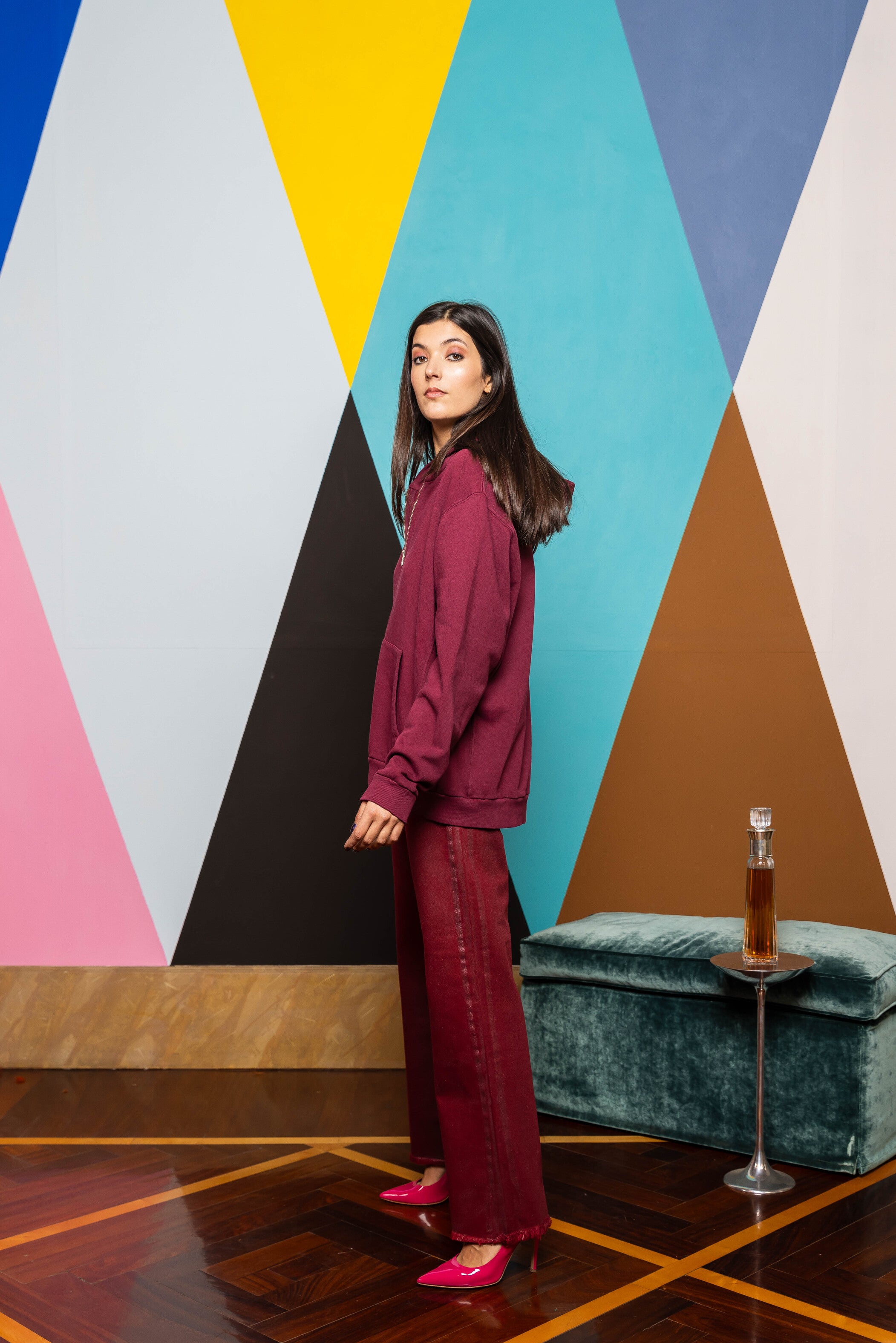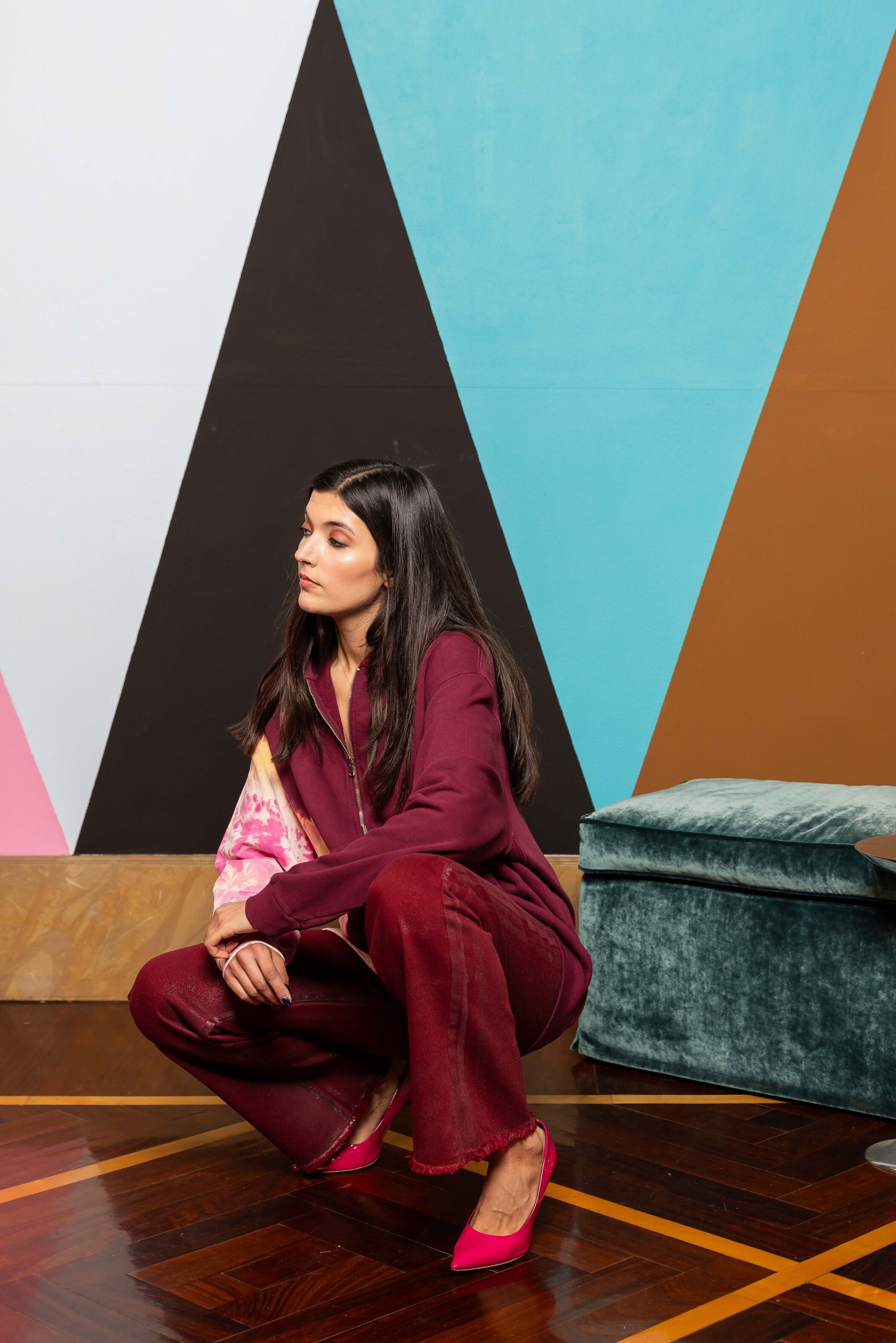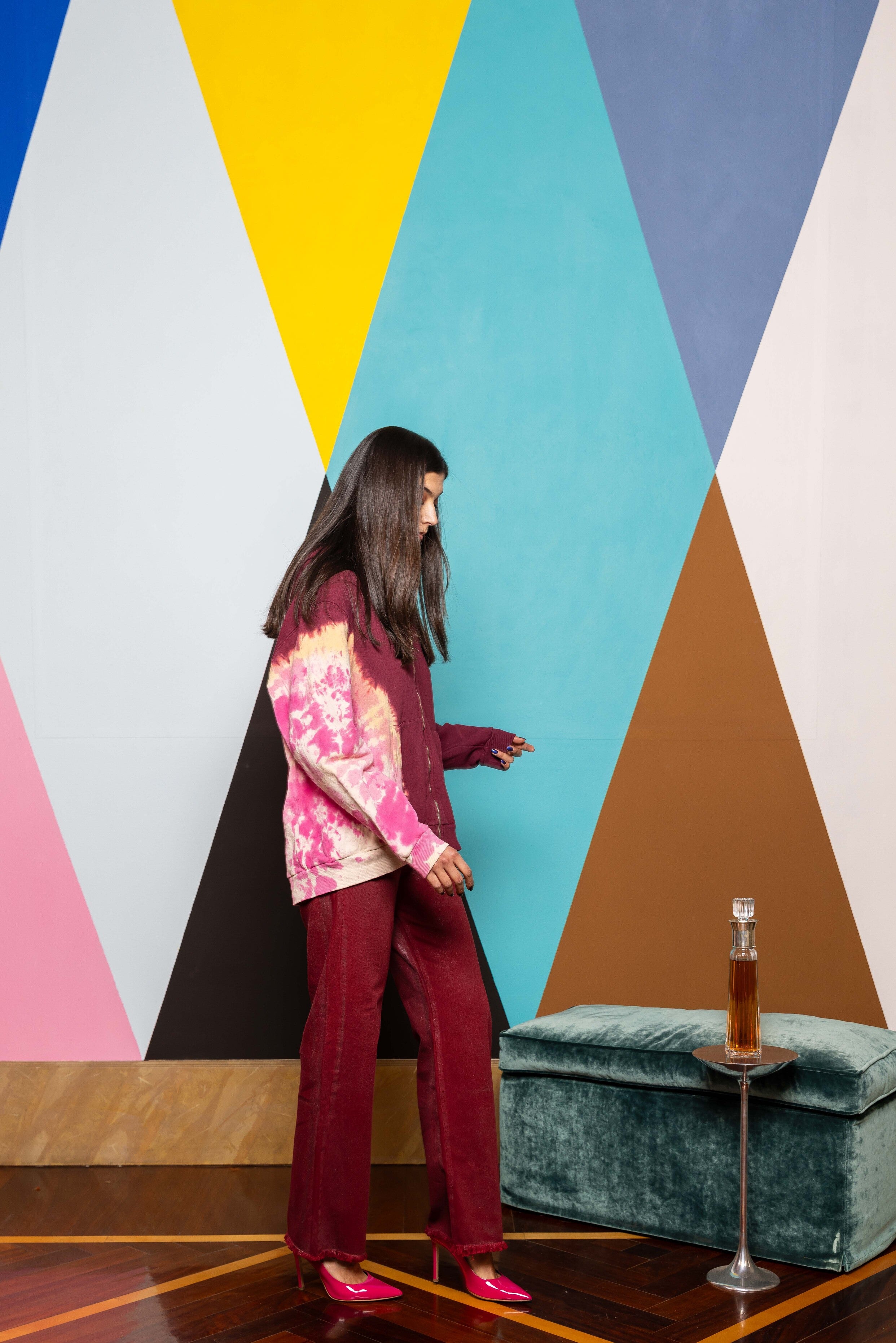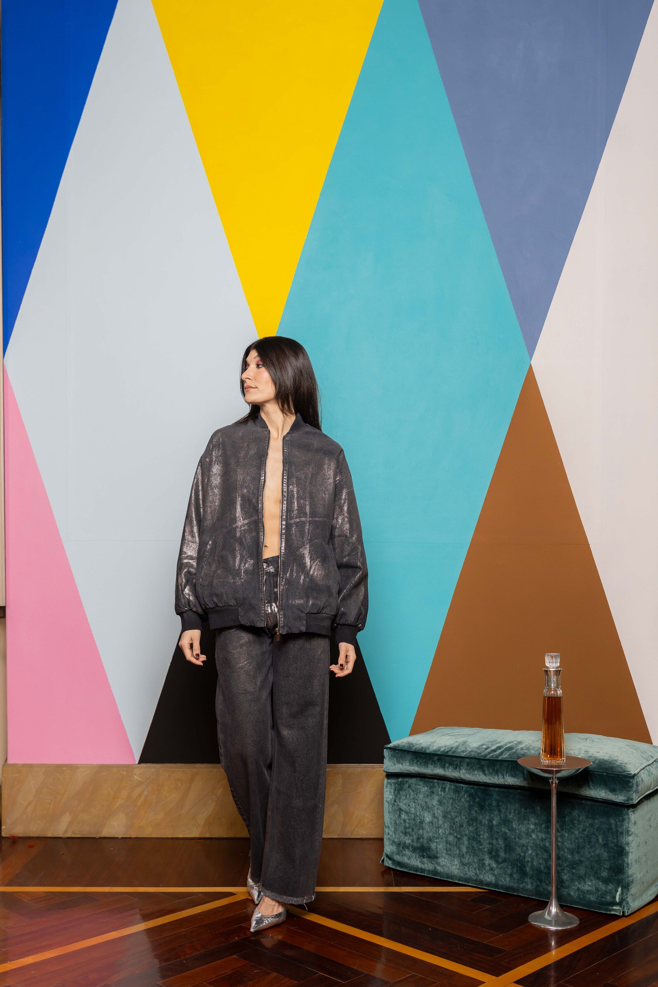 We just elevated your high waist straight leg trousers thanks to our hand laminated denim. Raw hem detailing at the end.