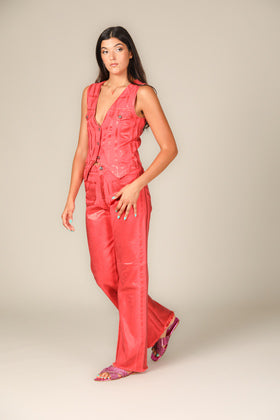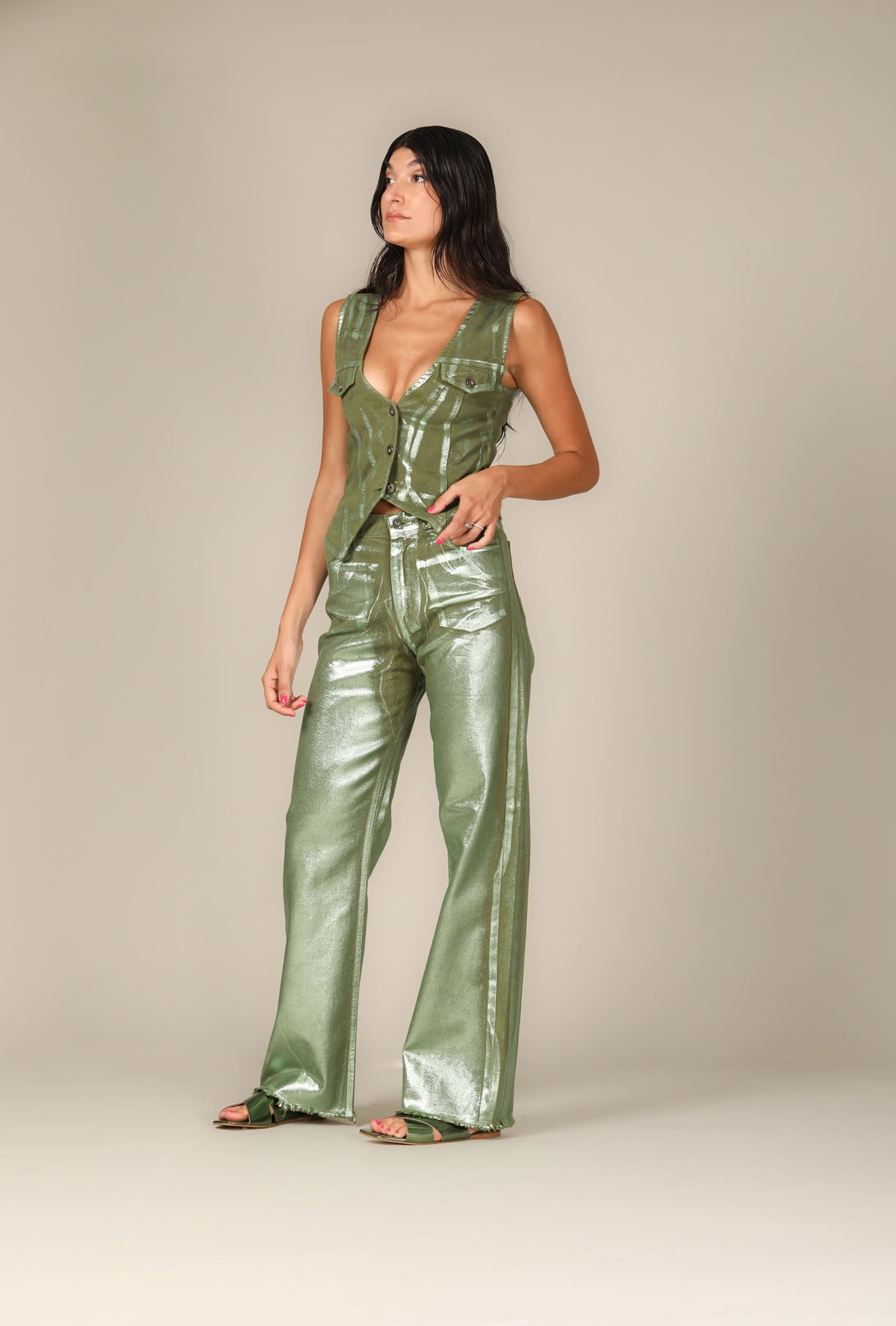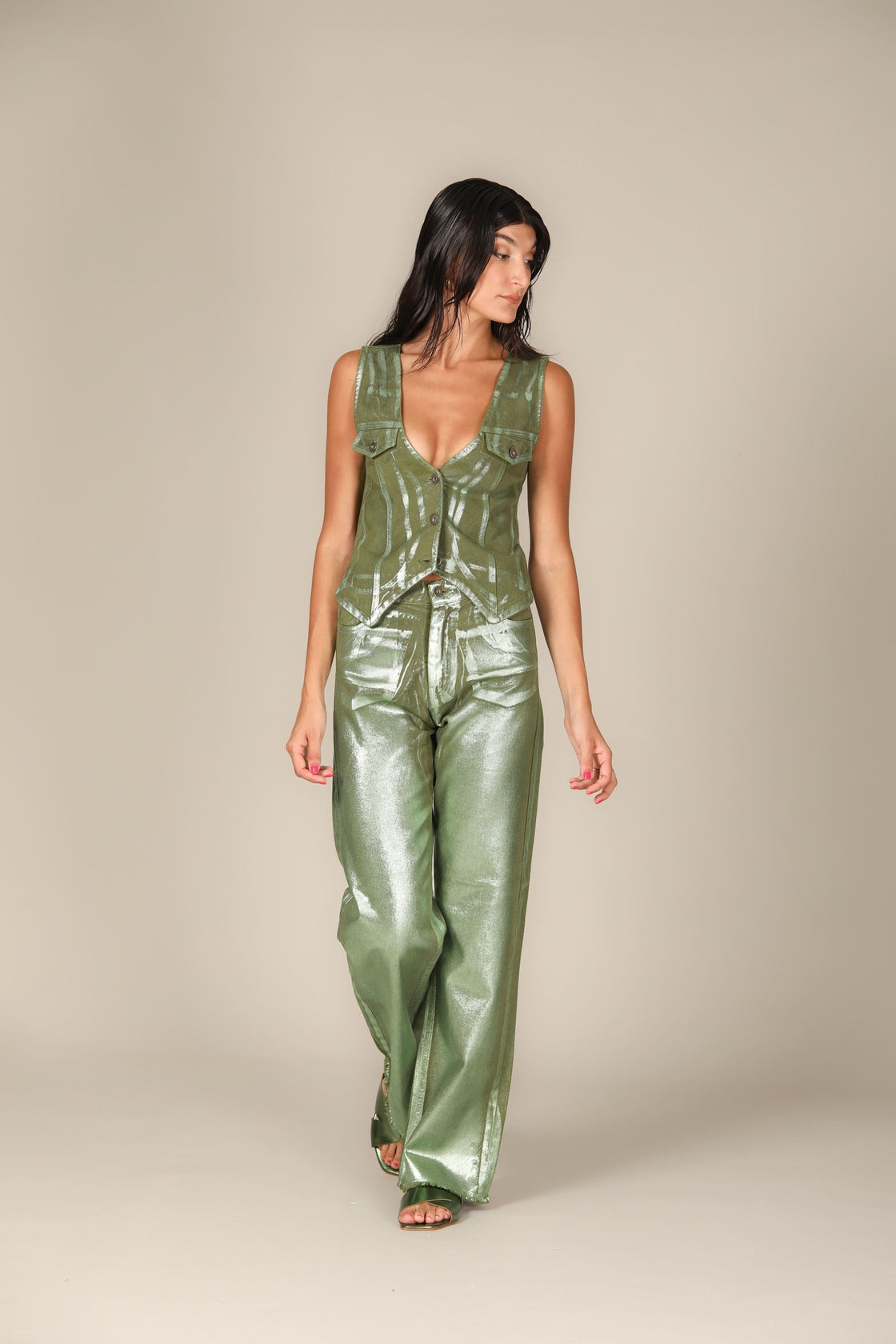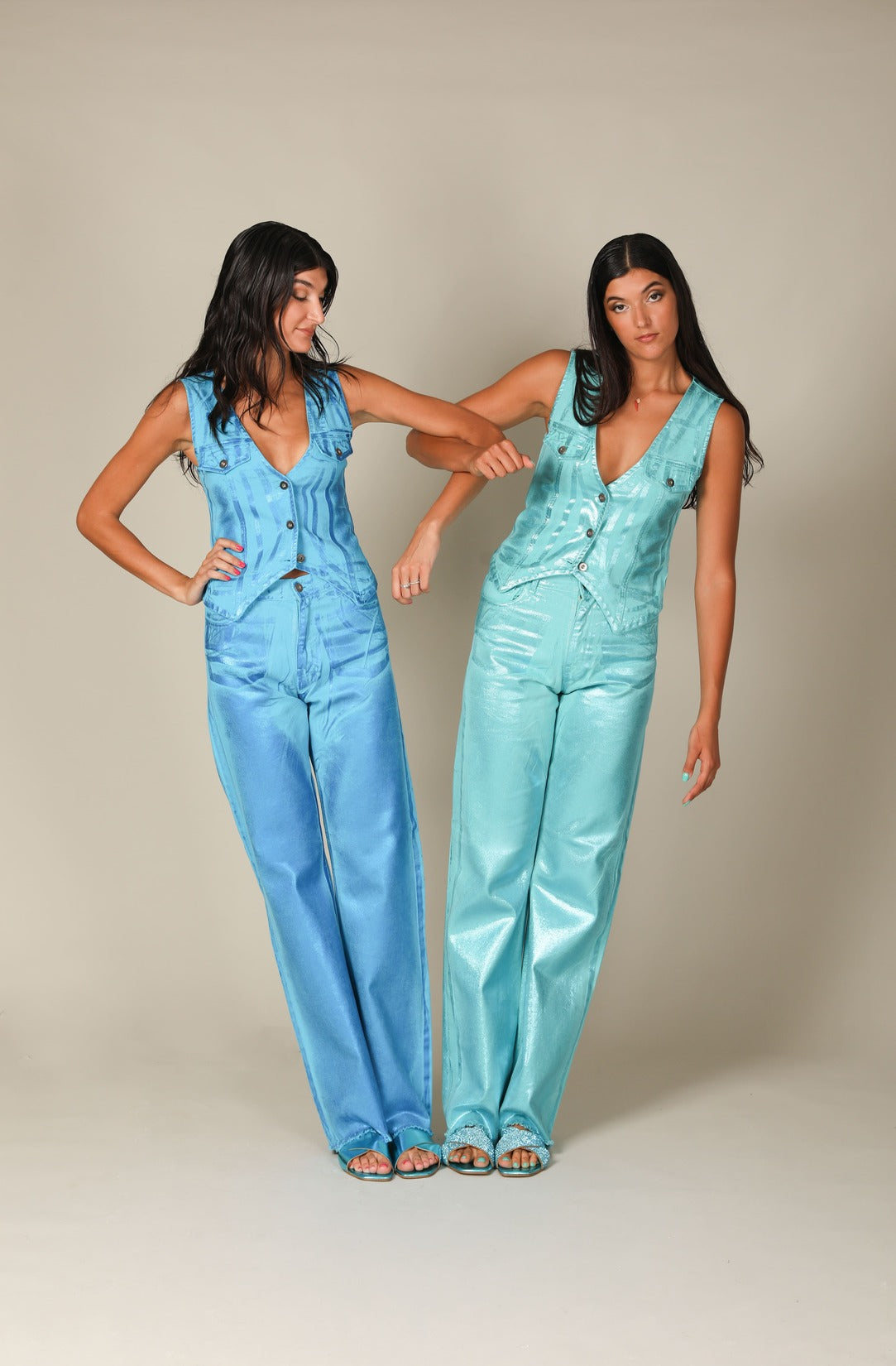 Our new waistcoat, perfect for your everyday looks. Made in our signature laminated denim, hand made and applied to the finished garment, which creates a unique effect.
