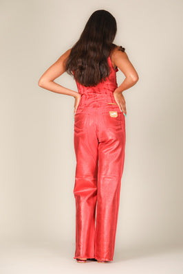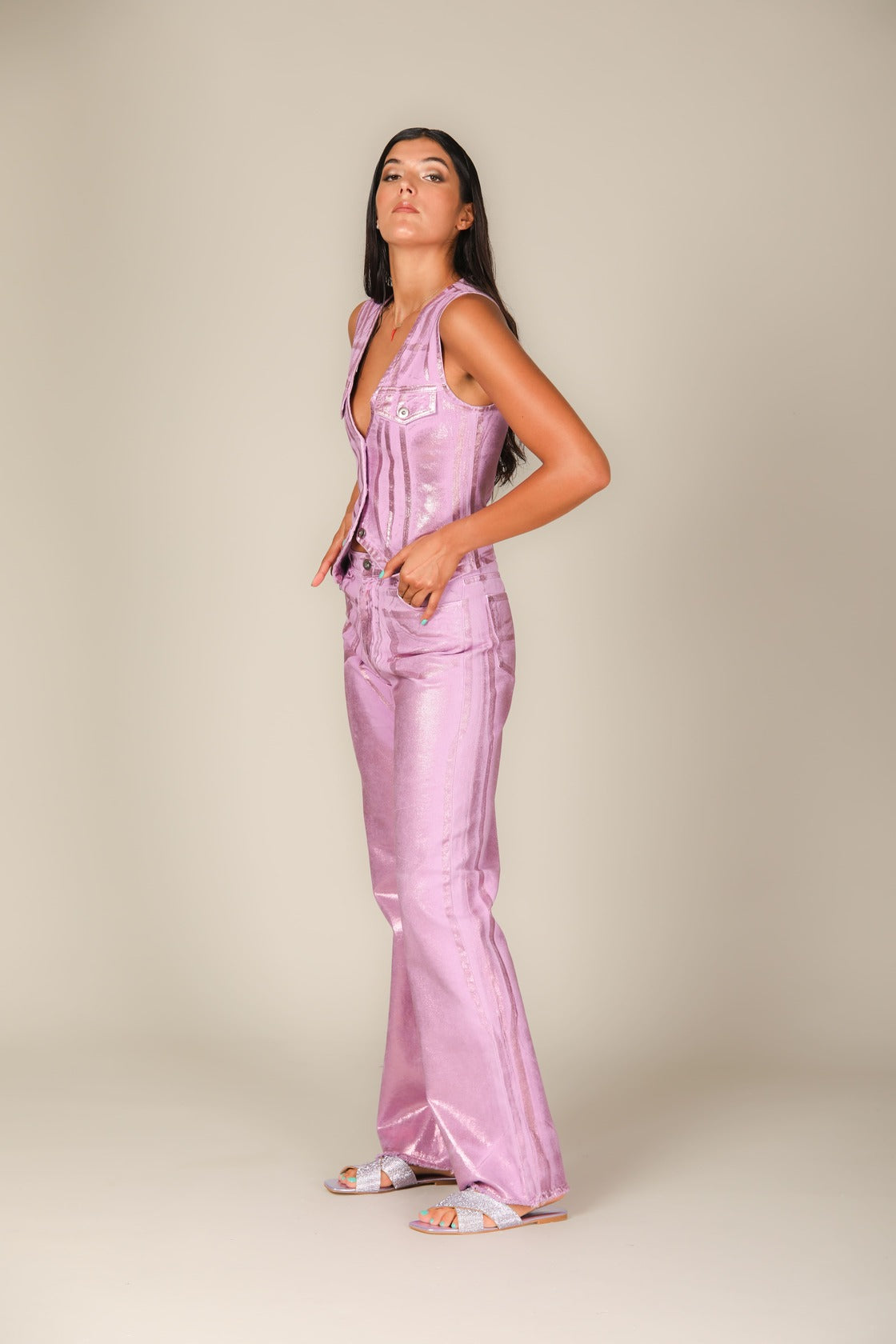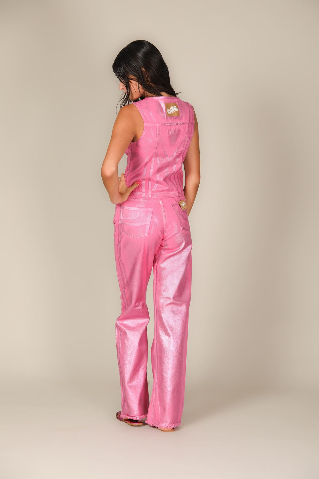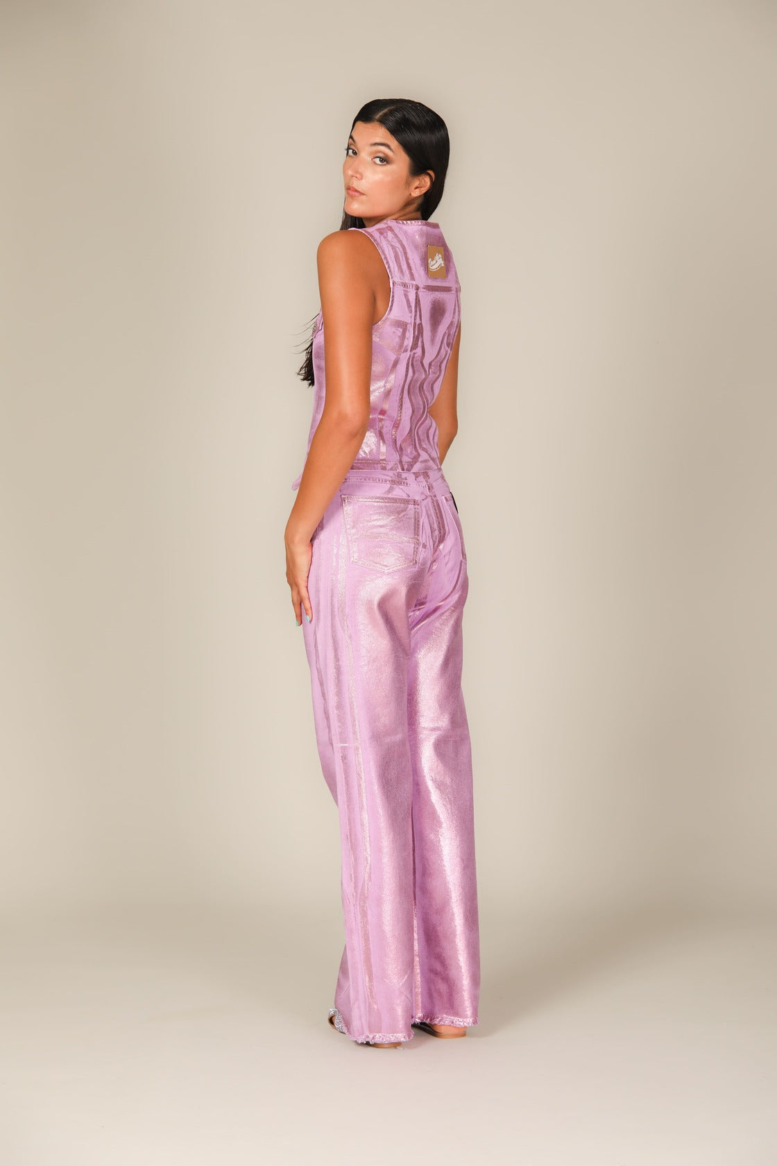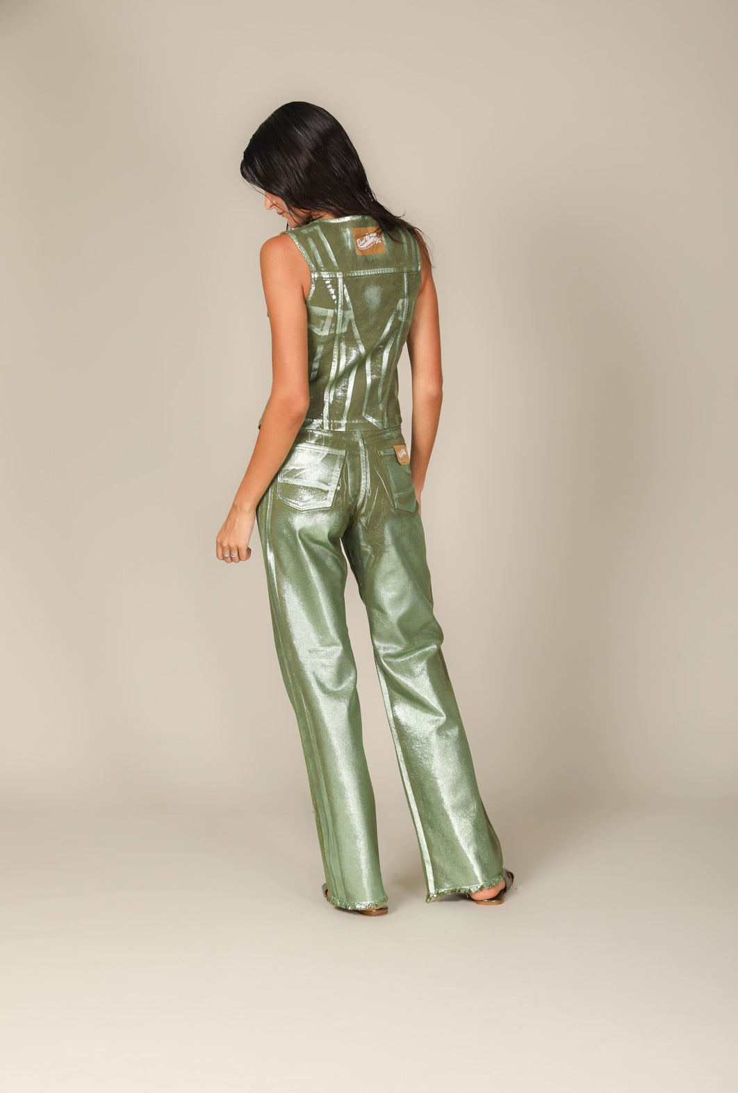 Our new waistcoat, perfect for your everyday looks. Made in our signature laminated denim, hand made and applied to the finished garment, which creates a unique effect.