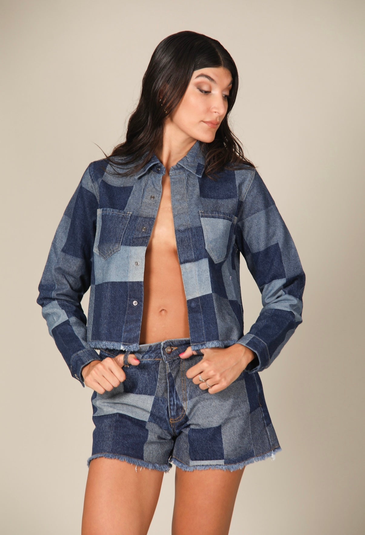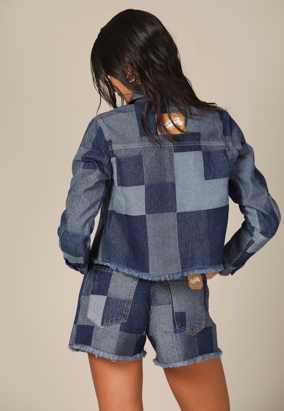 Our cropped jacket, featuring snap buttons and a raw hem. Made in our patch denim.