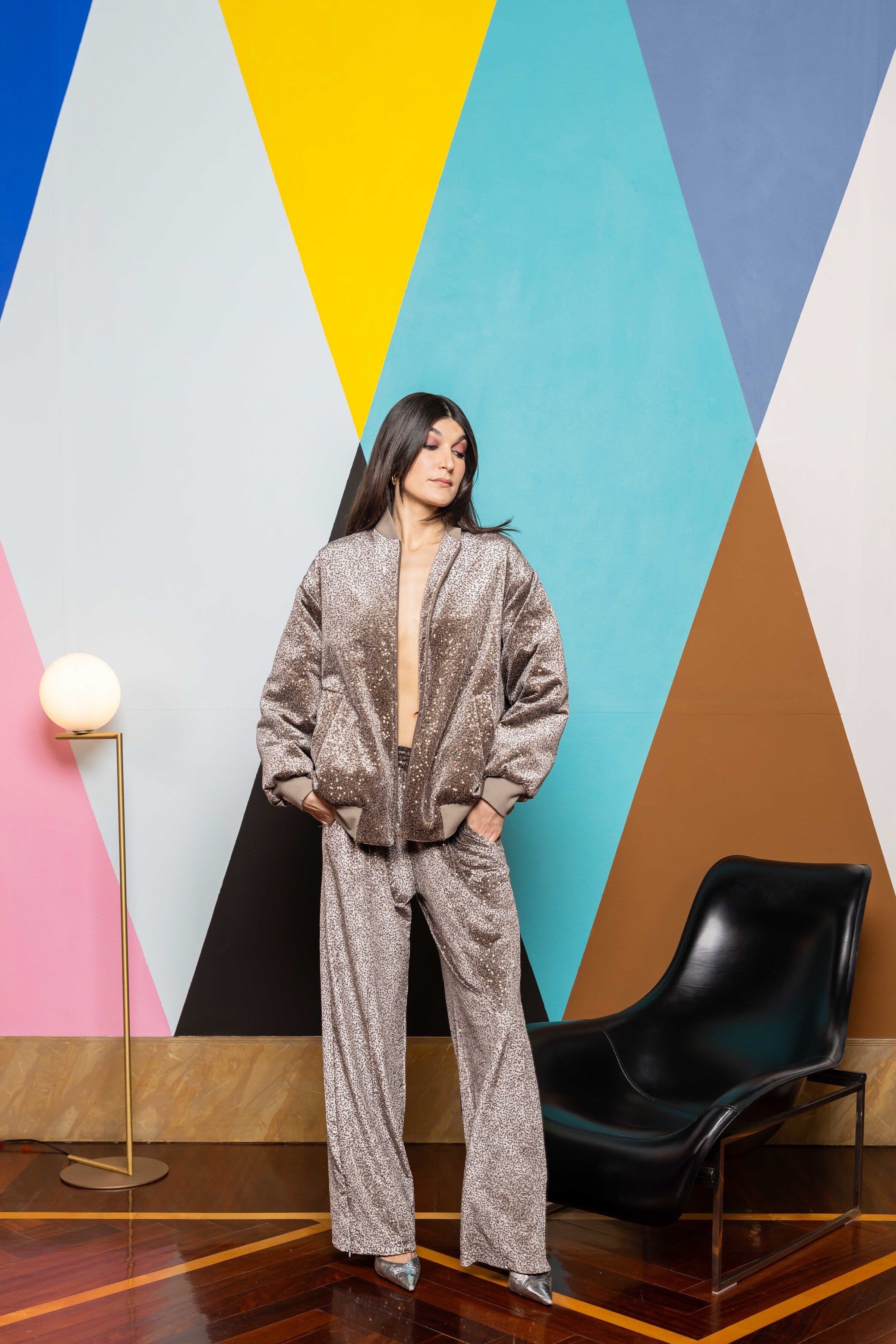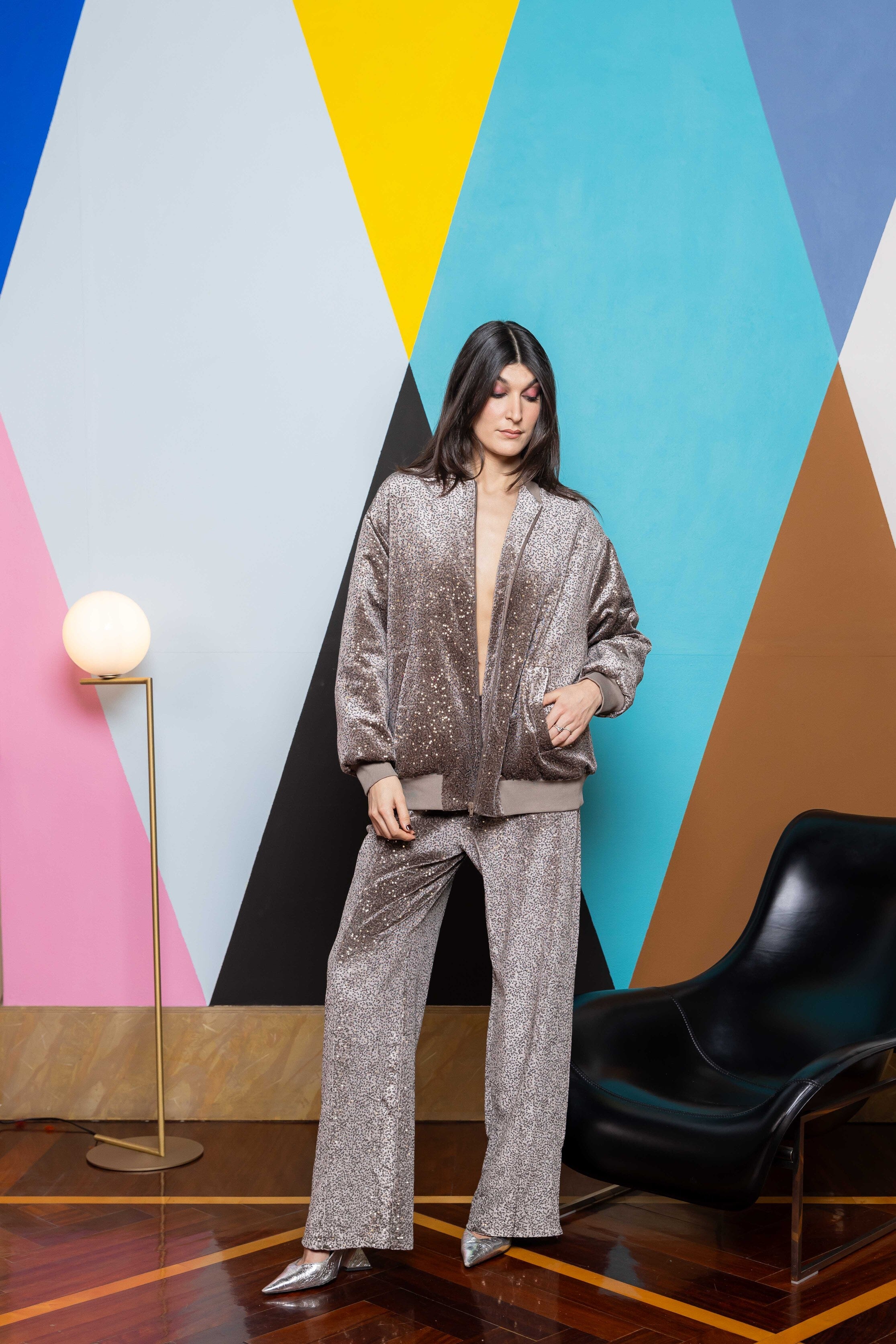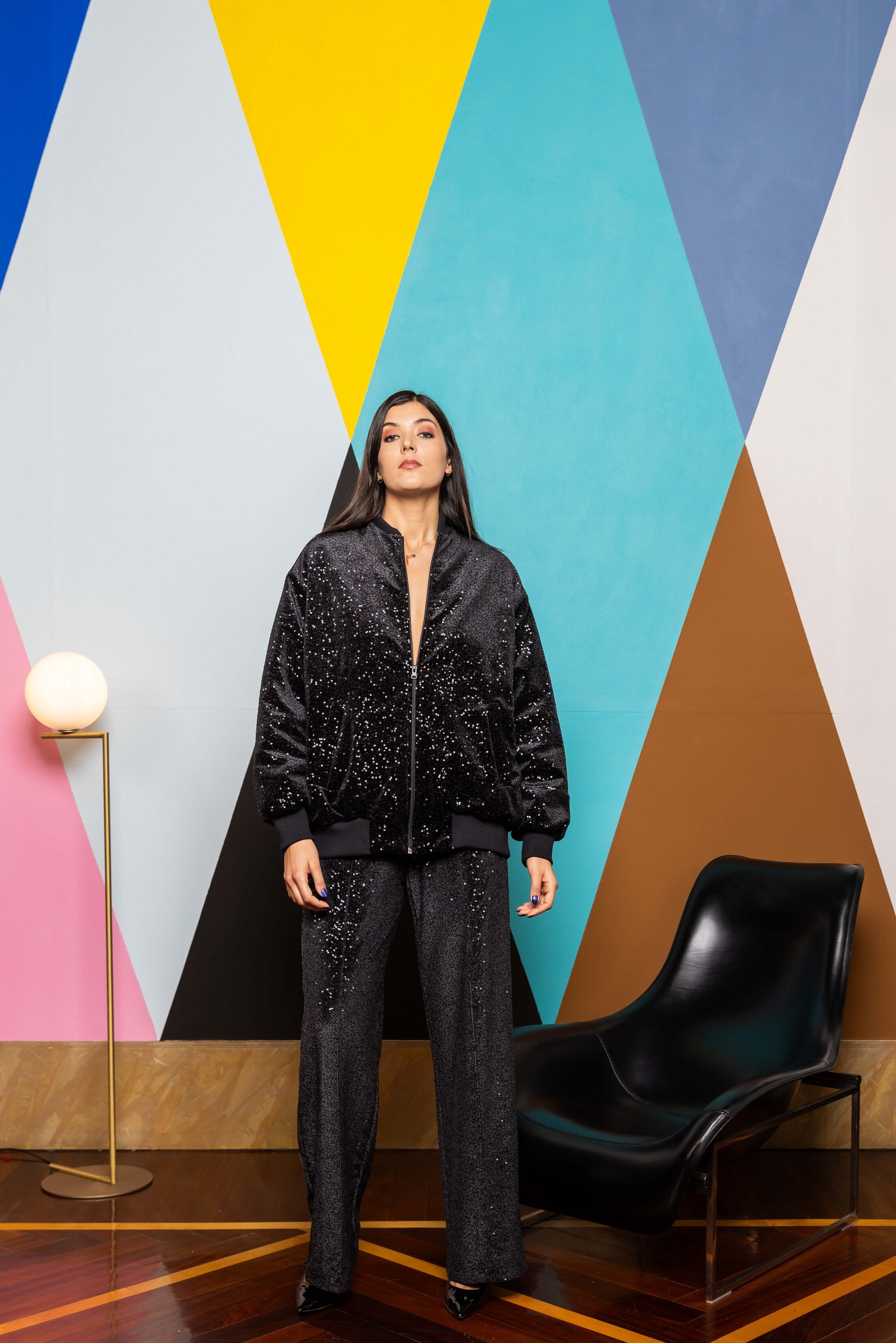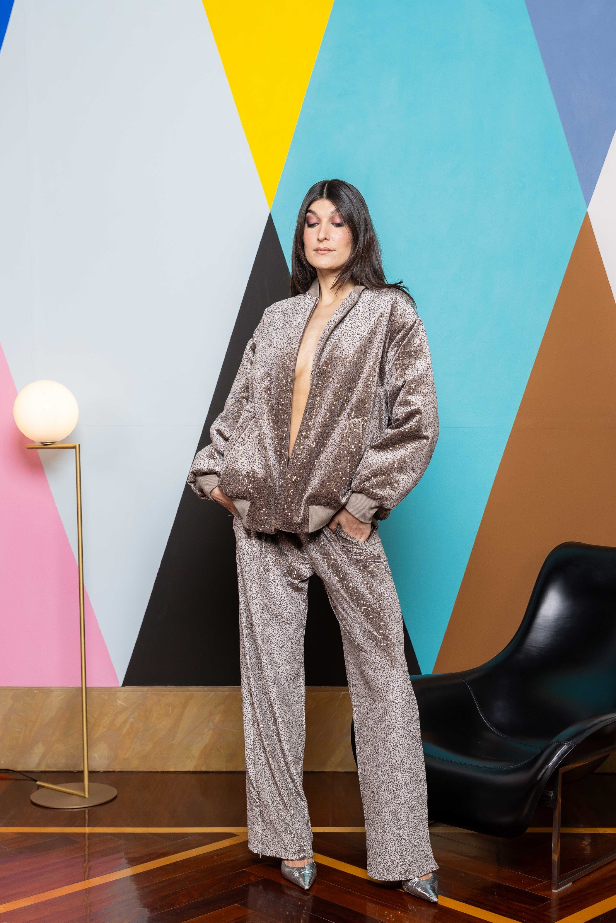 Our sequin velvet sweatpants perfect for you everyday looks. Rib on the front and a side zipper detailing at the and to be opened and closed depending on the stying.