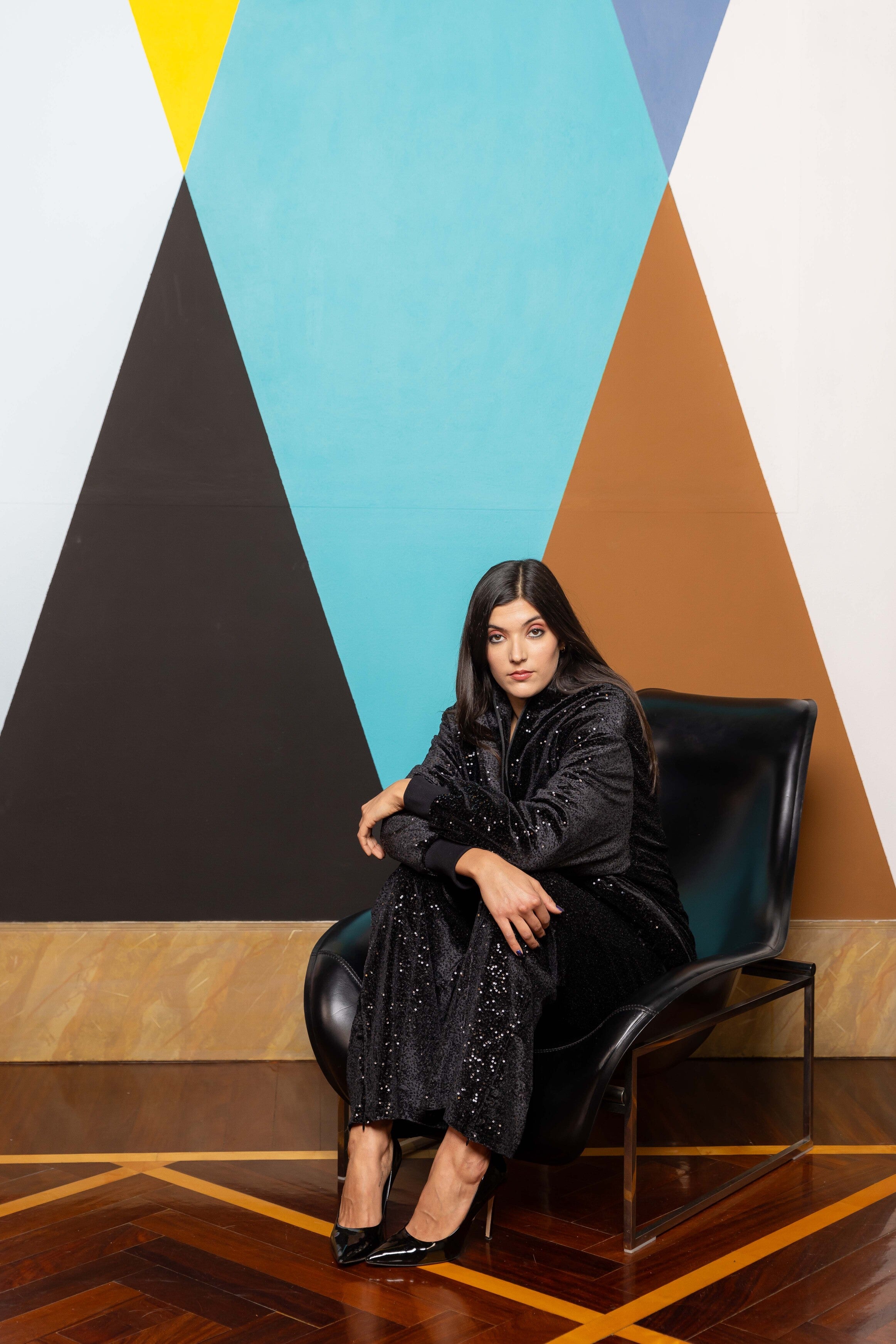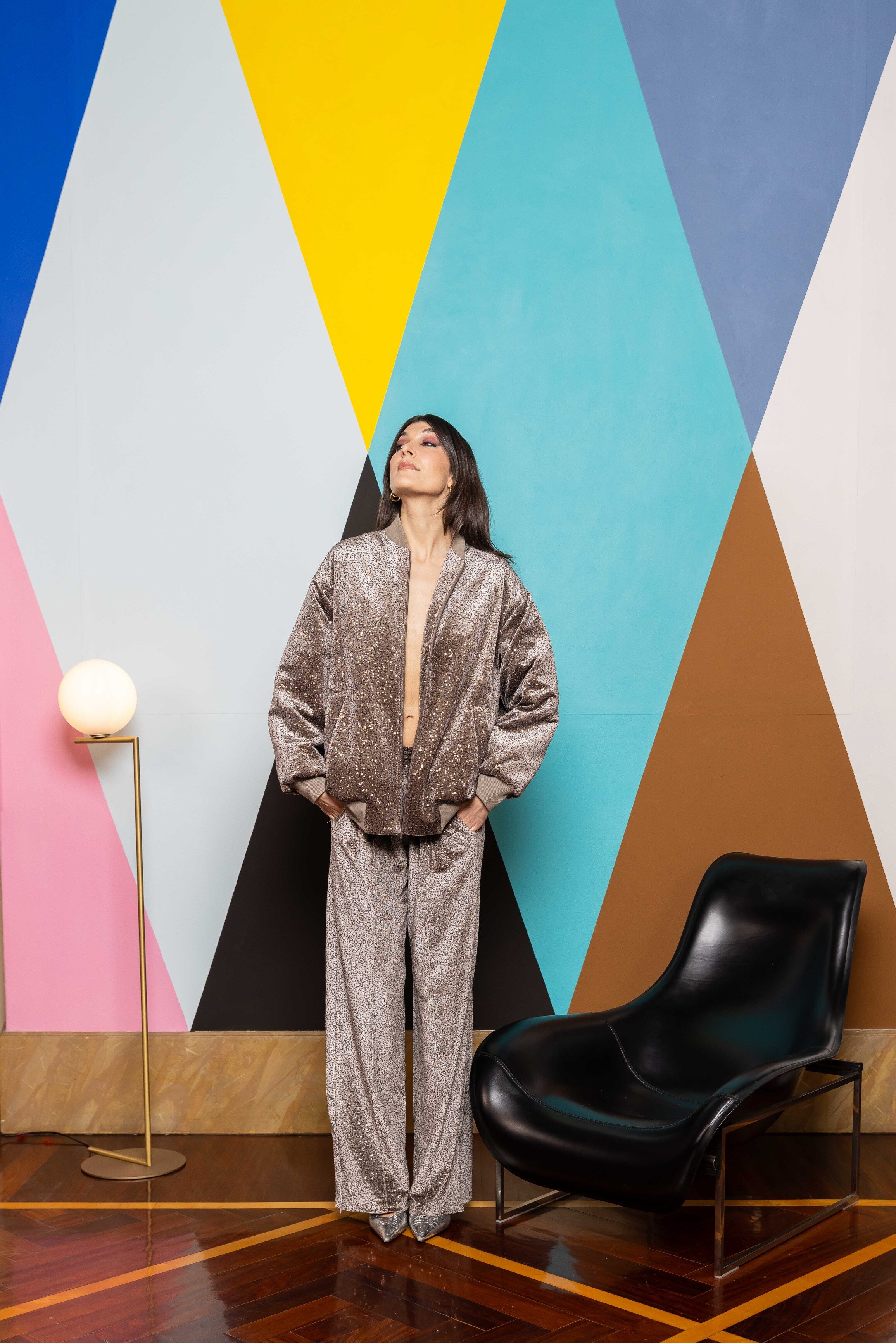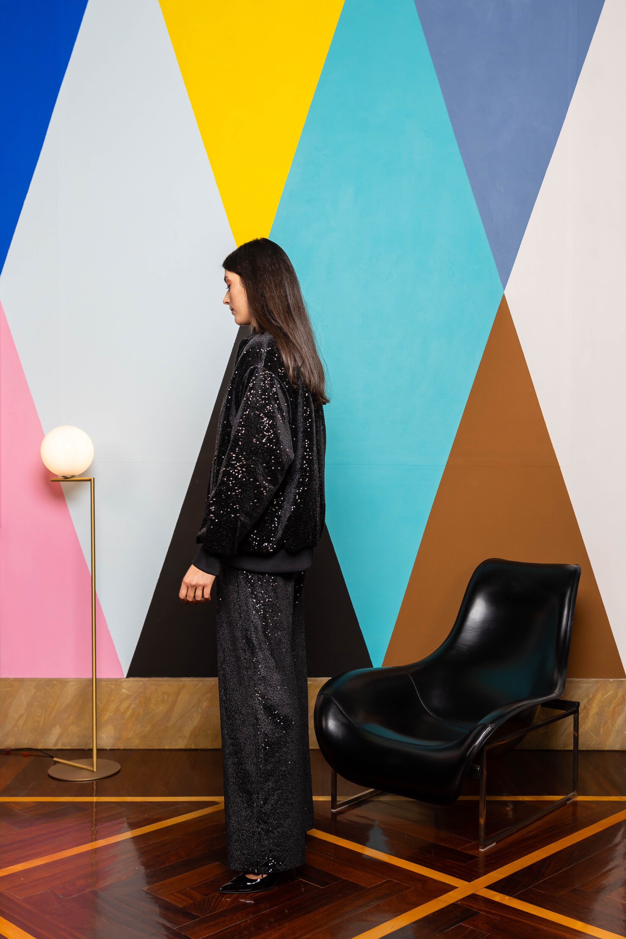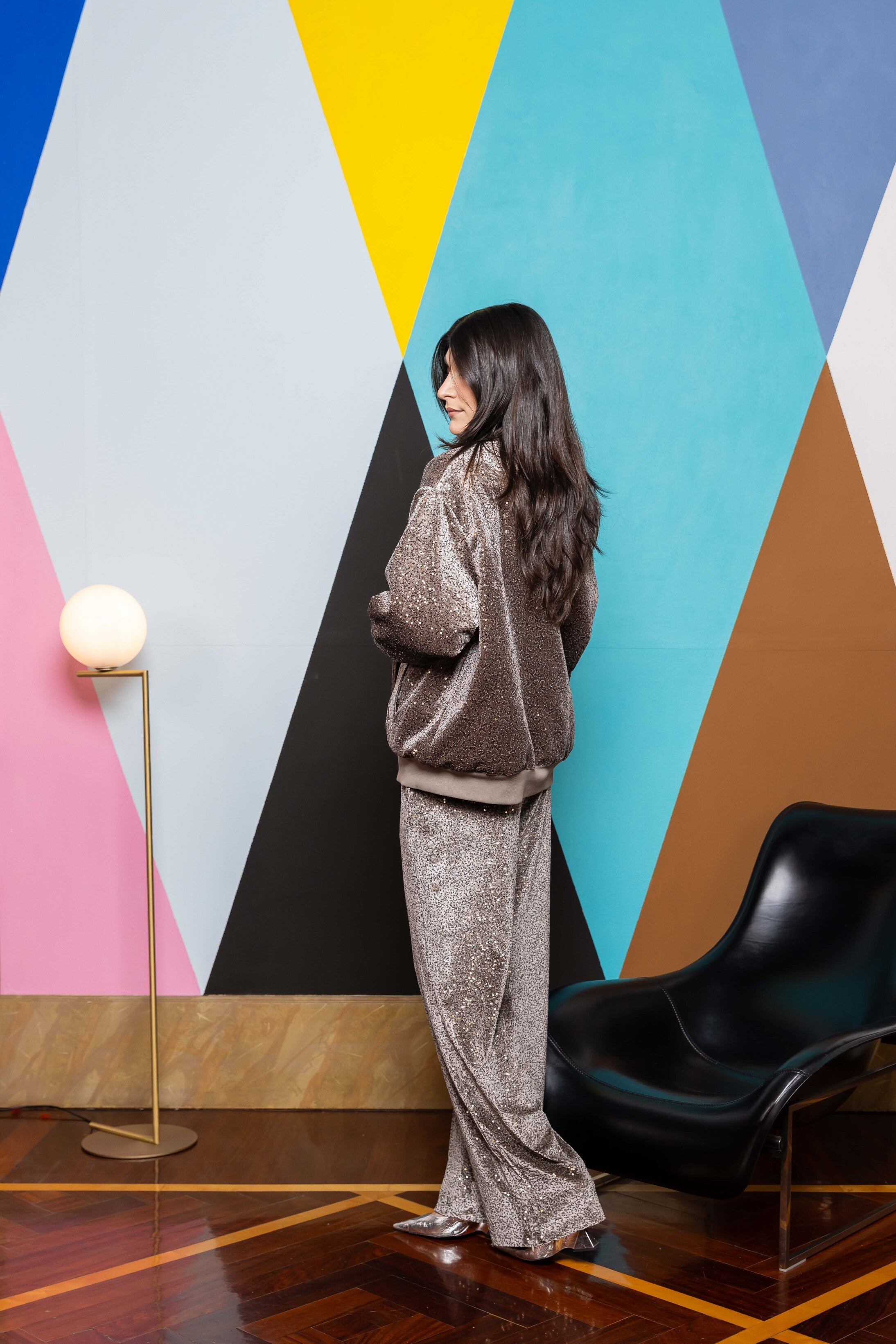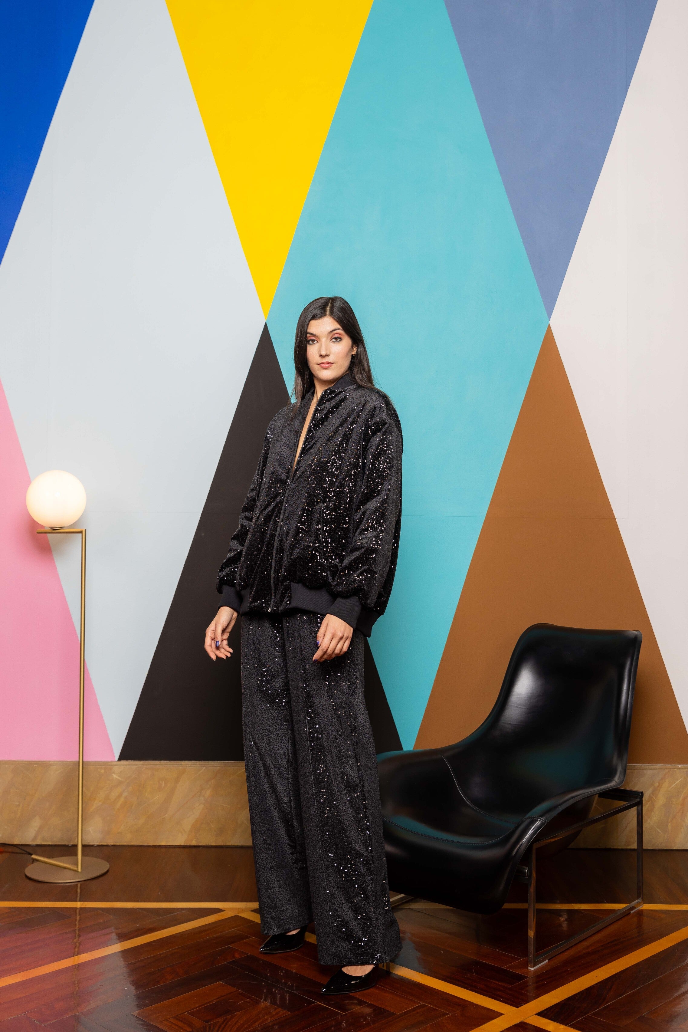 Our sequin velvet sweatpants perfect for you everyday looks. Rib on the front and a side zipper detailing at the and to be opened and closed depending on the stying.