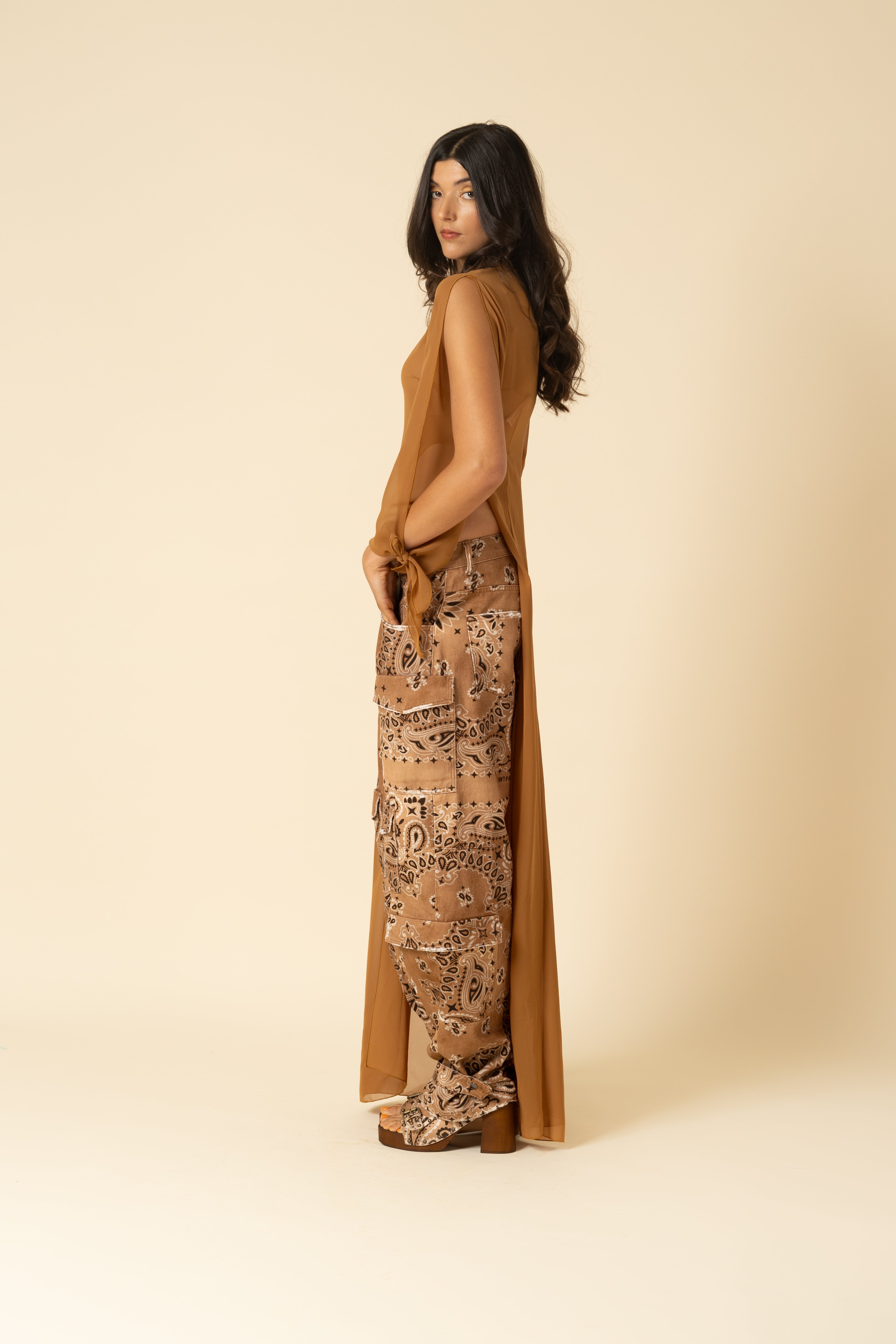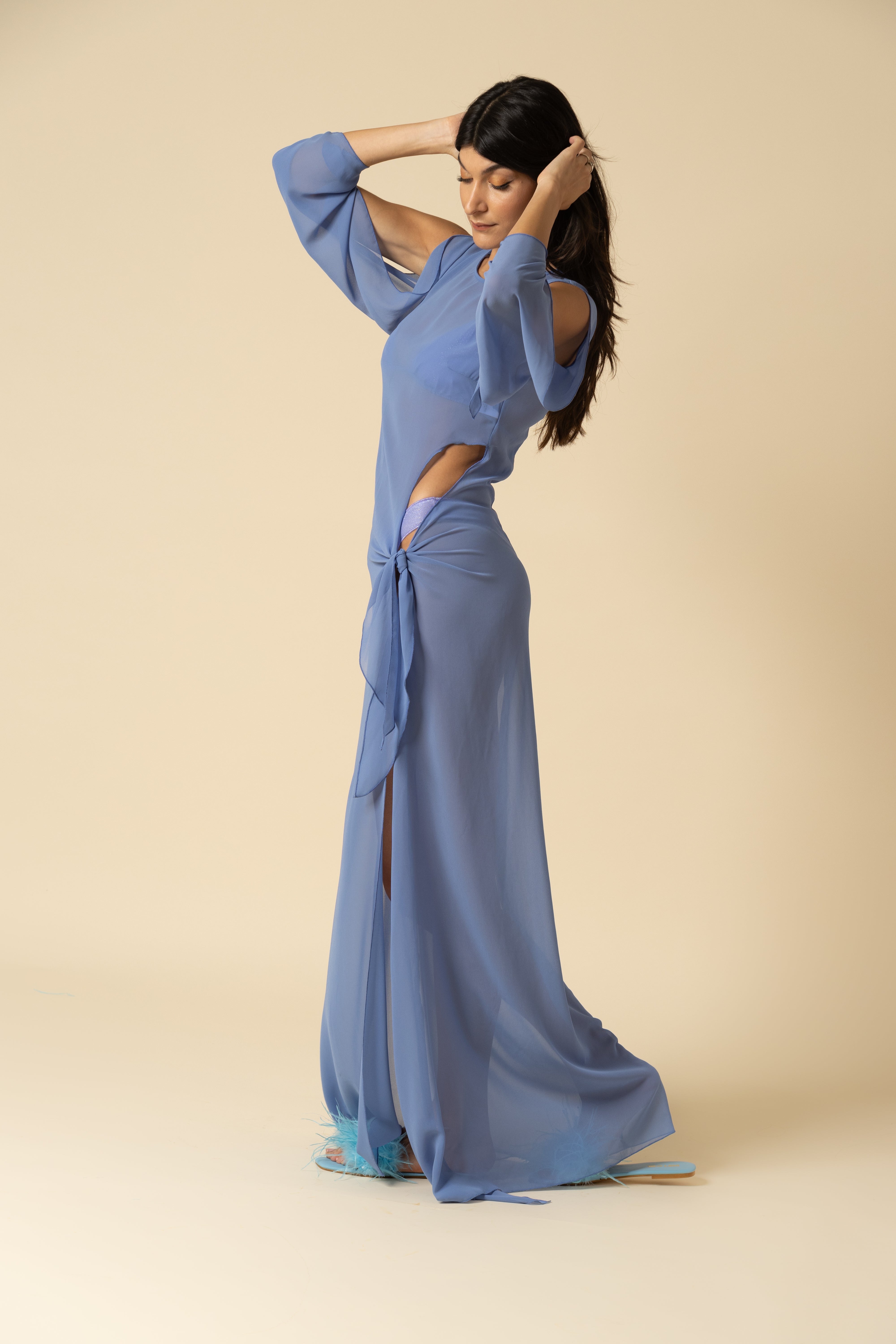 Maxi dress in georgette. Side tie and on sleeves. Zip on the back.